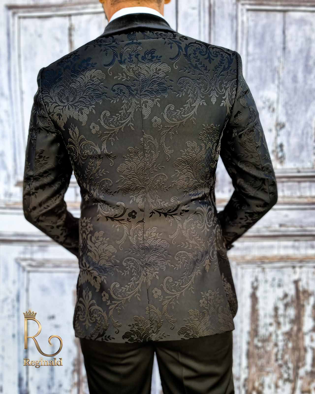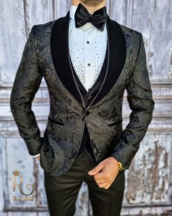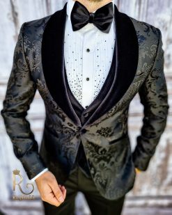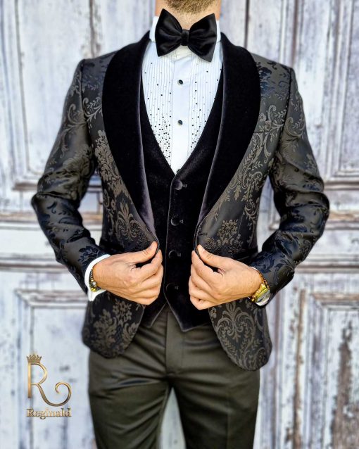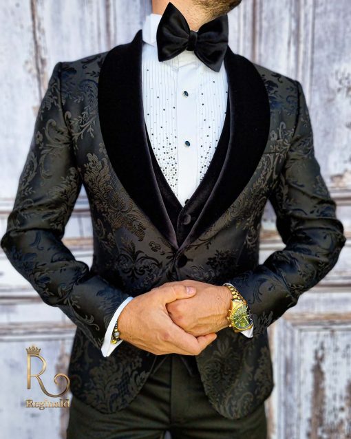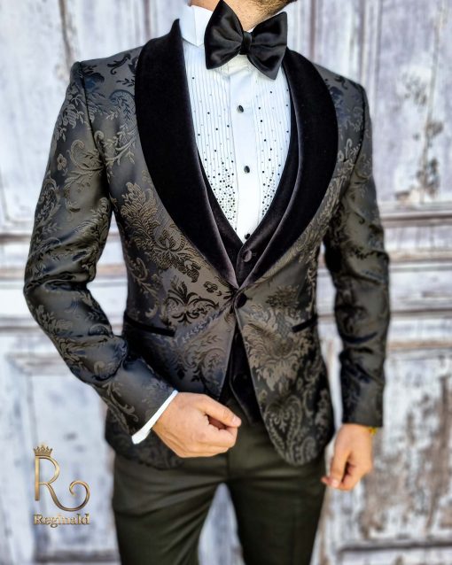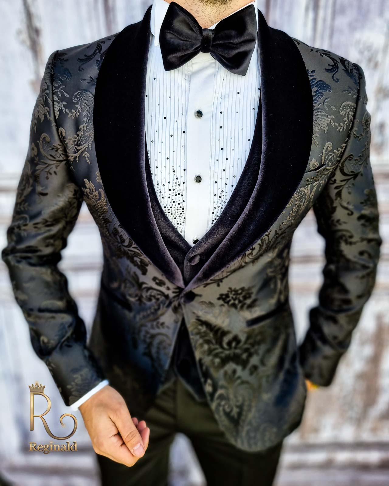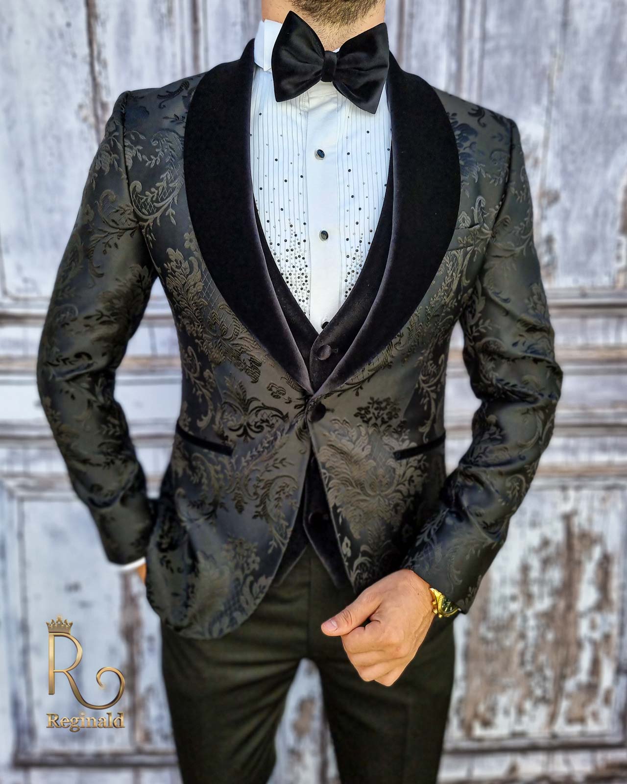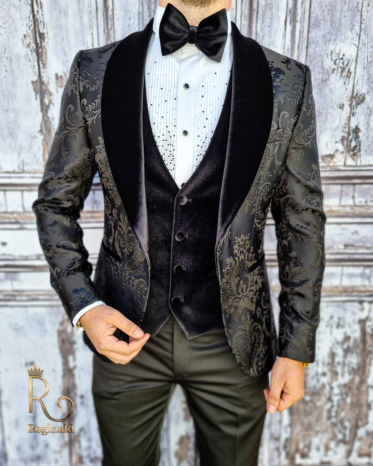 Costum ceremonie ginere/mire negru, Sacou-Vesta-Pantalon-Papion, Colecția Nunta Reginald