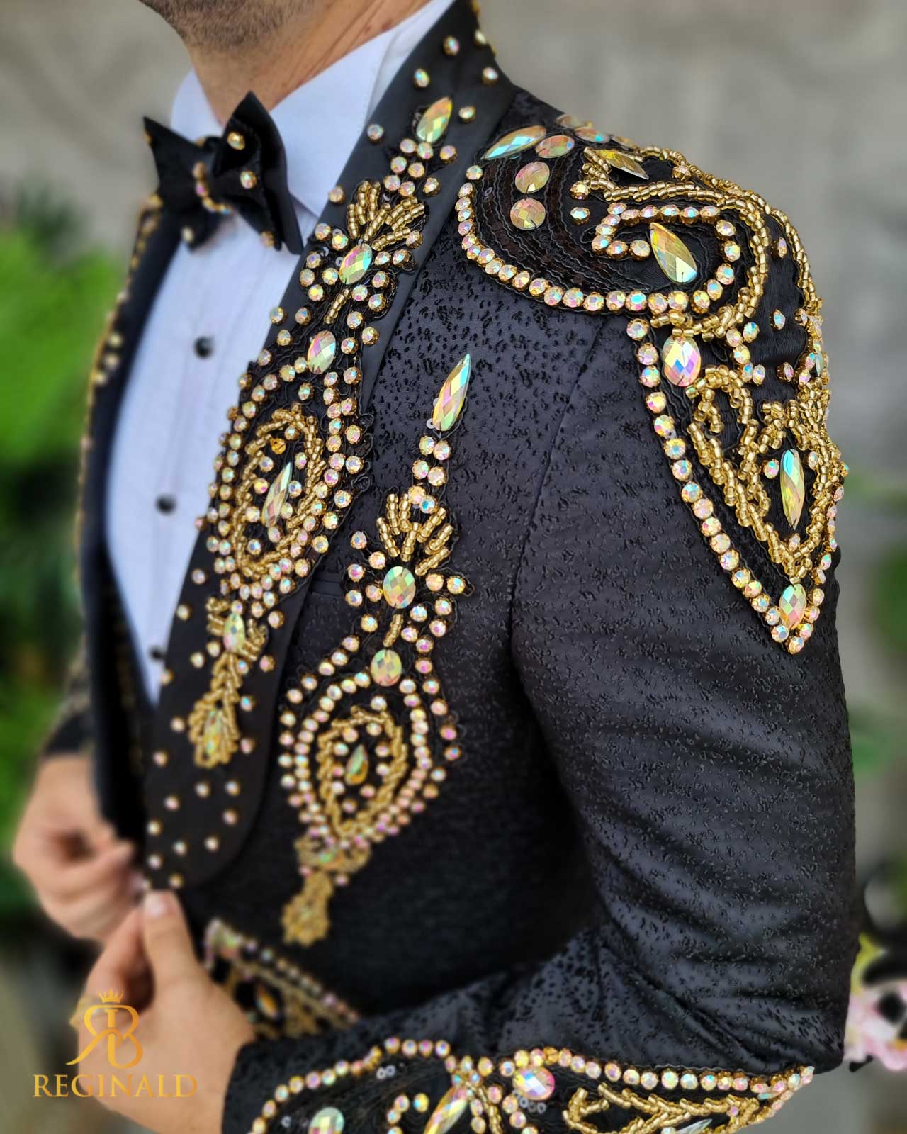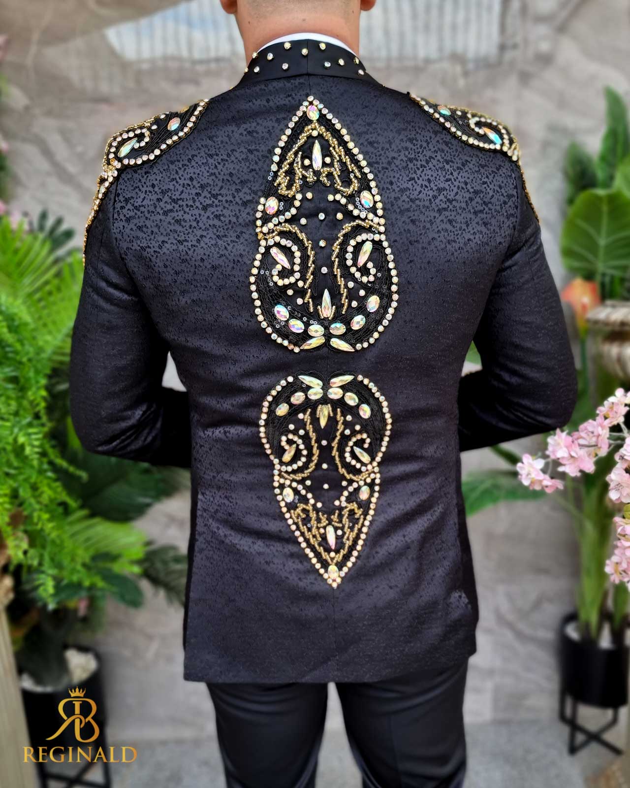 Sacoul are gulerul rotund, pietre stralucitoare aplicate