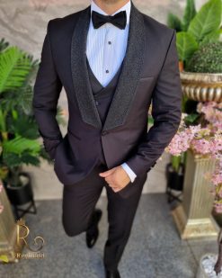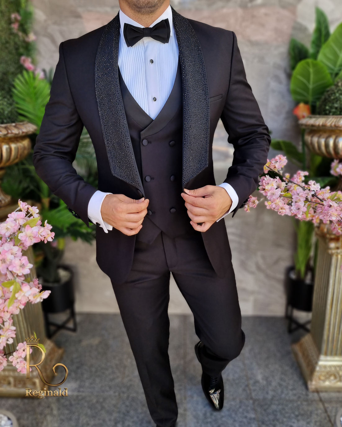 Sacoul este cu rever spitz, negru , strasuri negre aplicate