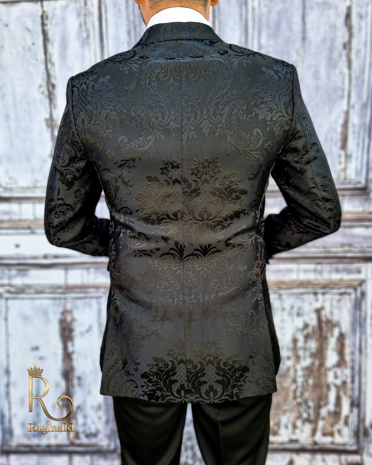 Sacoul este negru cu imprimeuri 3D, rever satinat