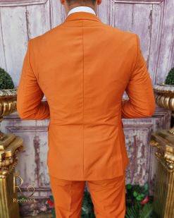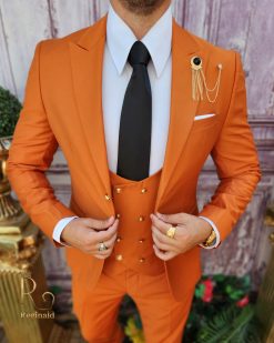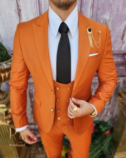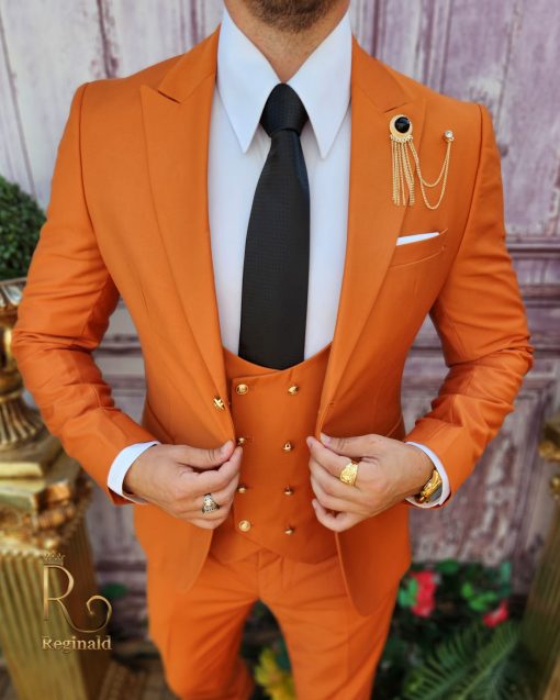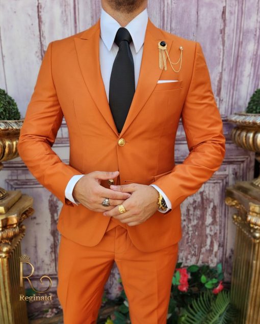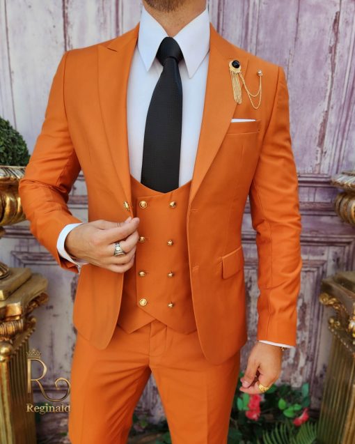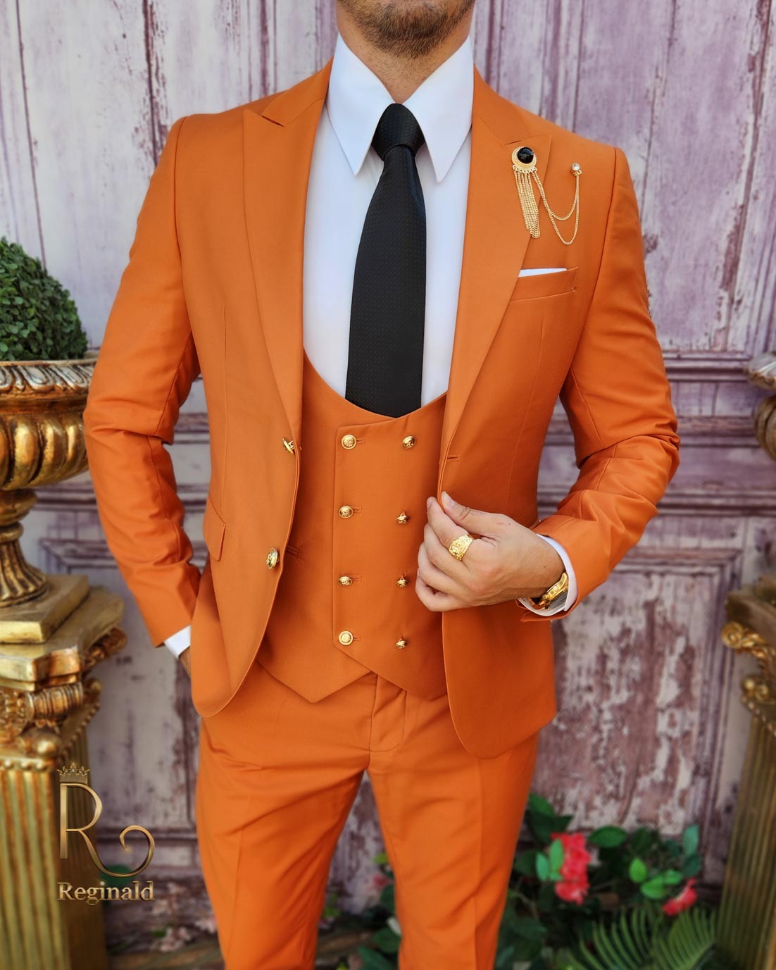Costum portocaliu cu butoni aurii: Sacou, Vesta si Pantalon – C3871