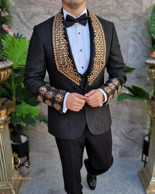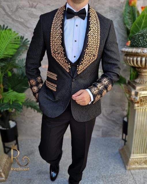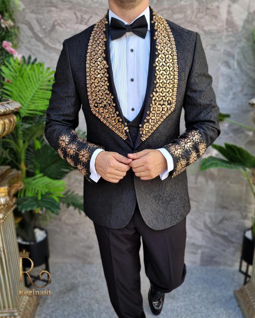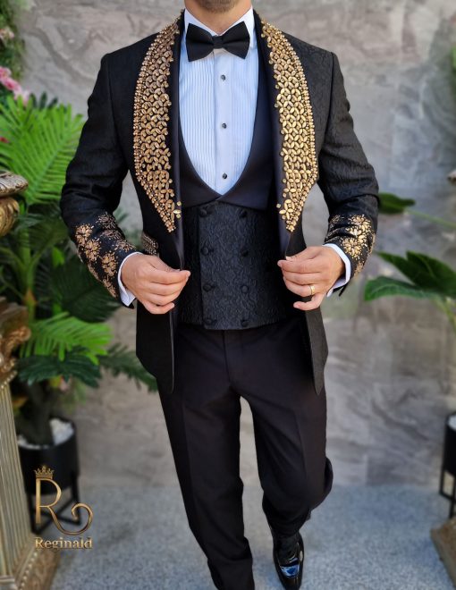 Produsul face parte din colecția unică Reginald, cunoscută pentru calitatea și stilul său distinctiv. Setul este compus din patru piese: sacou, vestă, pantalon și papion, oferindu-ți o combinație completă pentru a-ți crea o ținută rafinată.