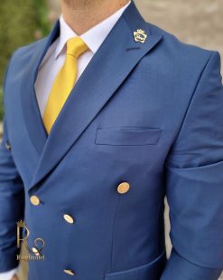 Sacoul prezintă un aspect clasic cu rever lat și se închide cu 2 randuri de nasturi, avand si o bata care se poate atasata pe rever. Manșetele discrete completează designul, oferind un aspect sofisticat și stilizat. Datorită croielii slim-fit, sacoul se mulează perfect pe corpul bărbatului, evidențiind forma sa și oferind o notă de eleganță contemporană.