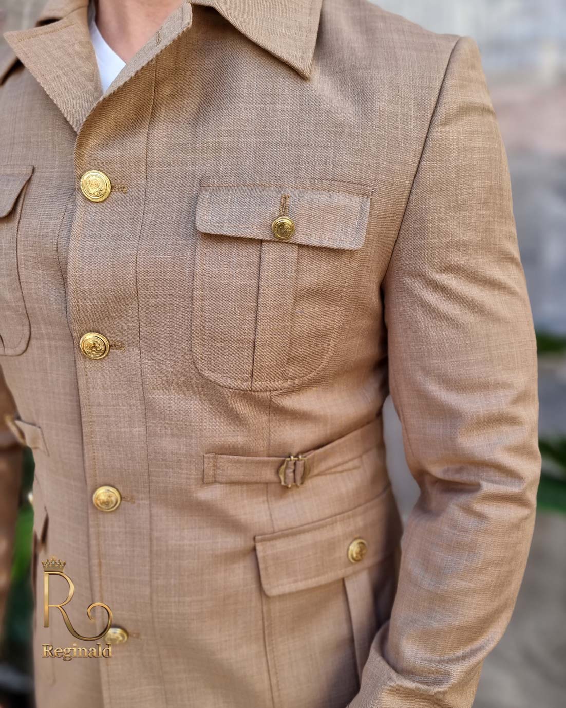 Sacoul este cu guler inalt, curele ajustabile in lateral, buzunare la piept si lateral cu nasturi aurii