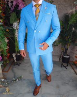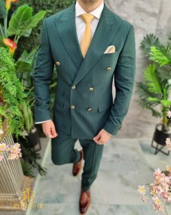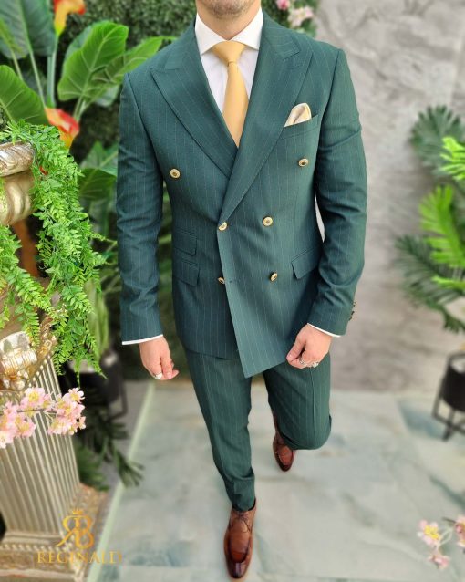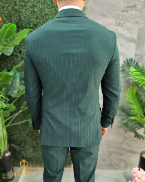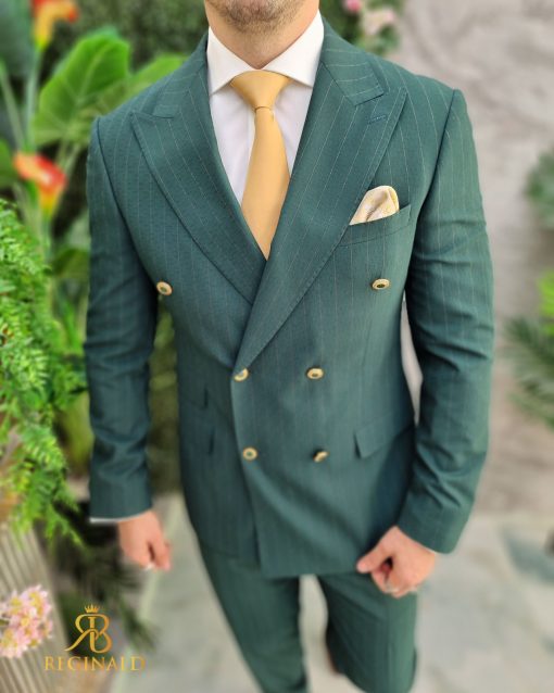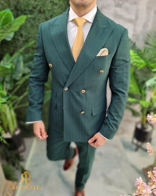 Costum Verde in dungi cu butoni aurii, Sacou si Pantalon – C4636
