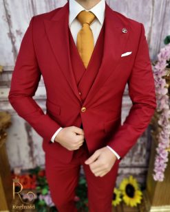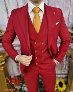 Costum visiniu deschis cu butoni aurii: Sacou, Vesta si Pantalon – C3415