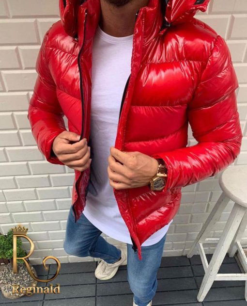 Geaca din fas rosie de barbati, groasa, cu gluga detasabila, colectia 2020