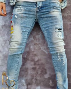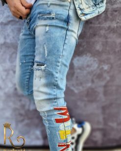 Blugii au o croiala slim fit, conica la glezne, imprimeuri pe partile laterale, cu stropi si rupturi decorative, fiind decolorati in partea superioara.