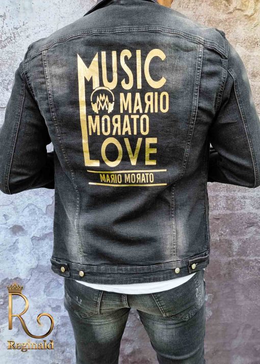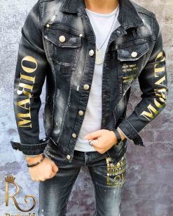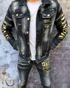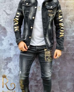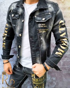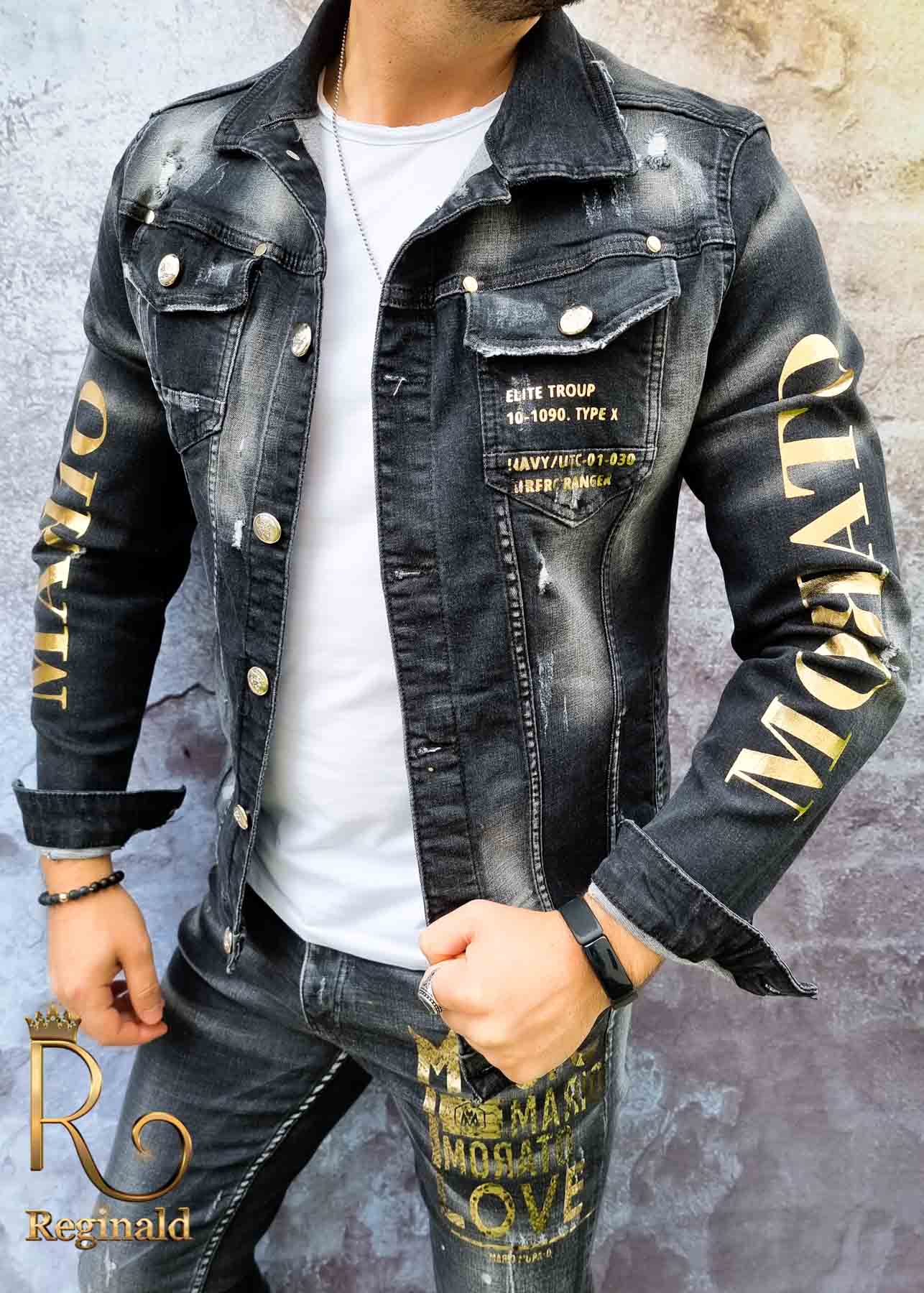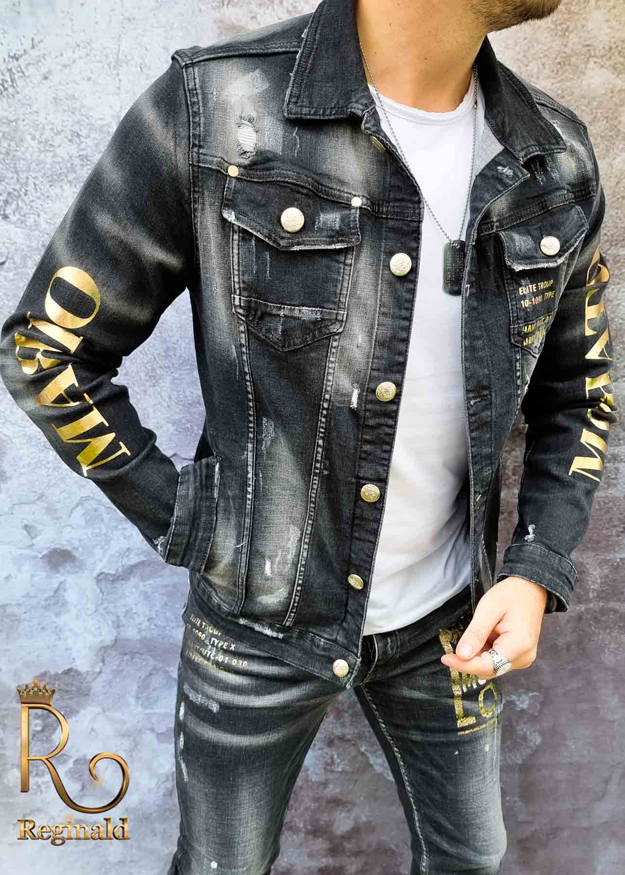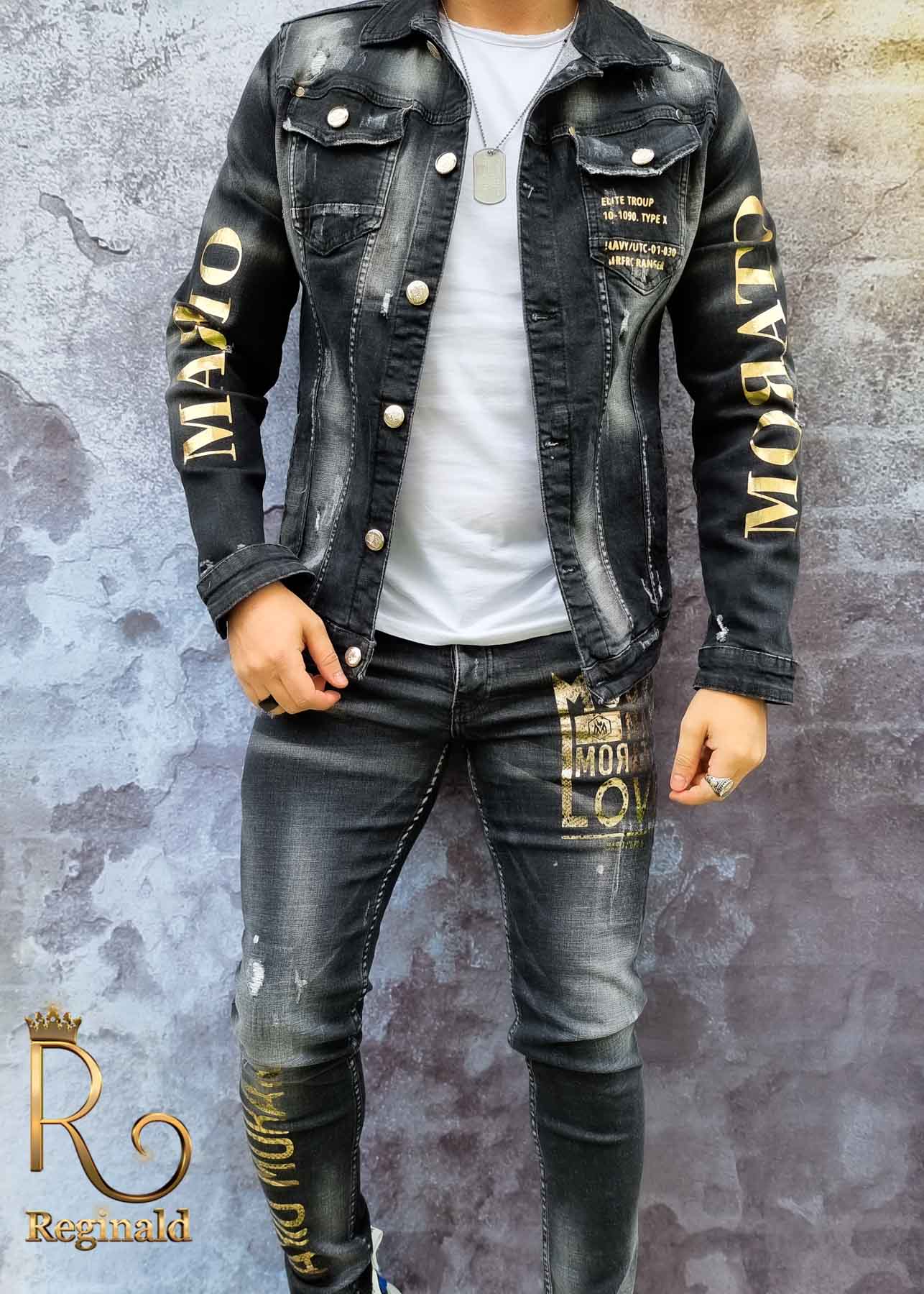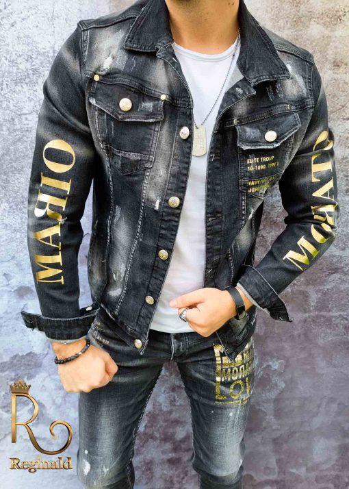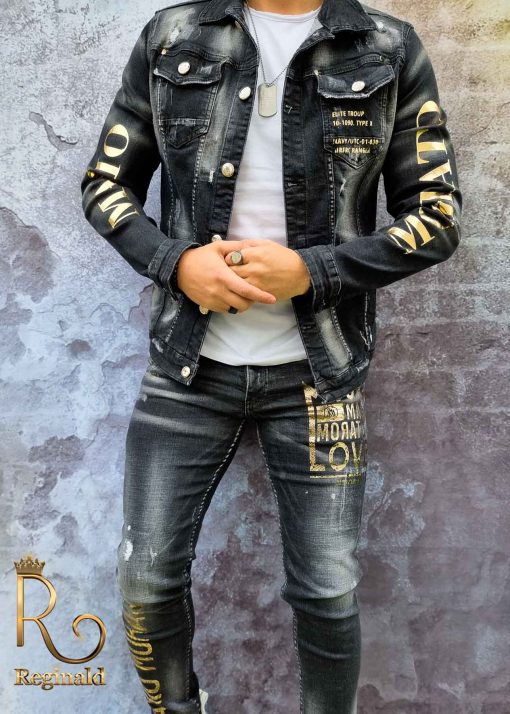 Jacheta +blugi de barbati negri, cu imprimeuri Auriu, croiala slim fit – Reginald Colectia 2021
