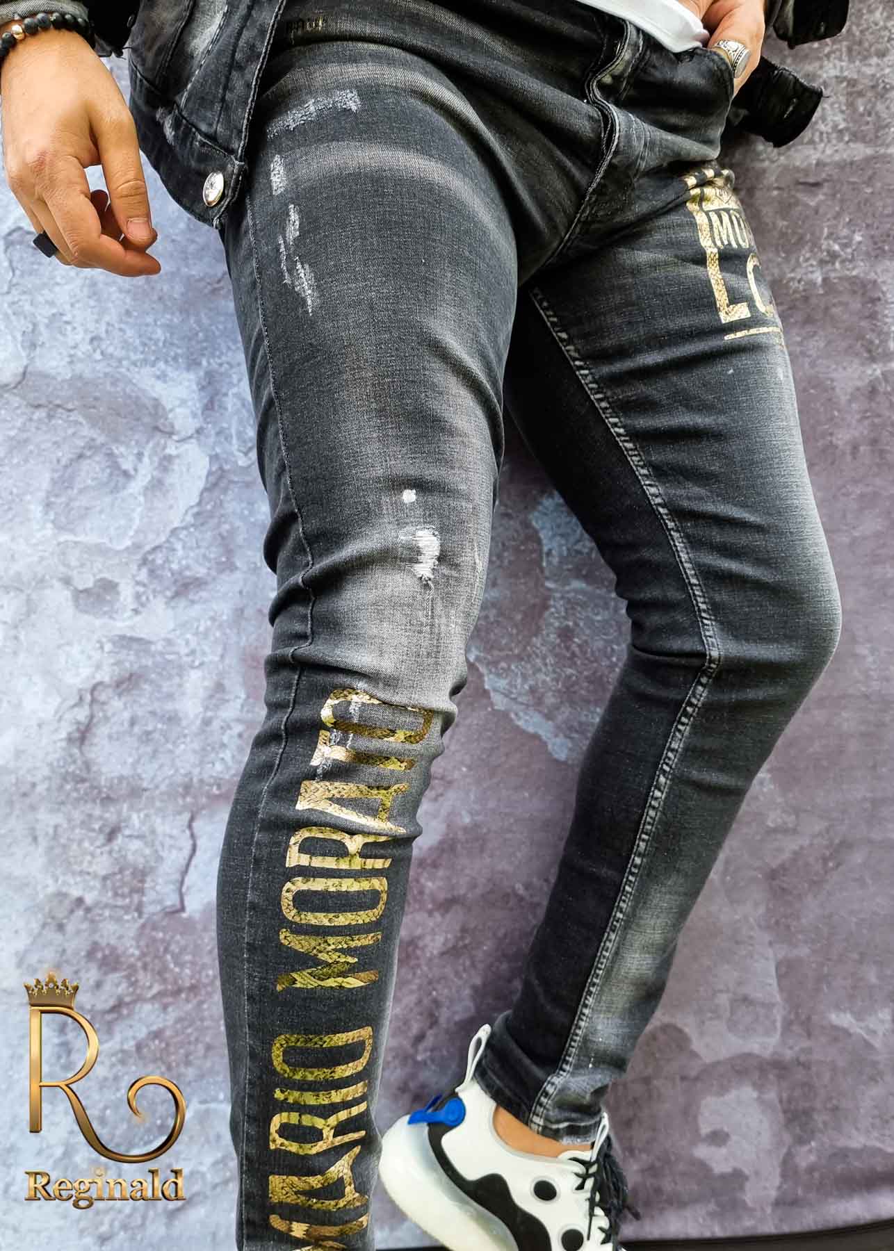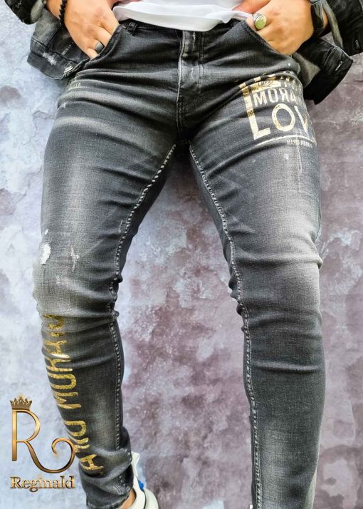 Blugii barbatesti au o croiala slim fit, conici, imprimeuri aurii aplicate.