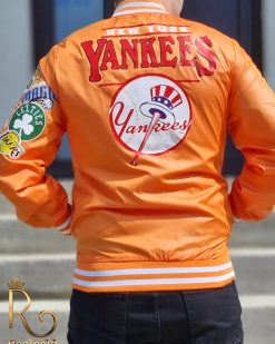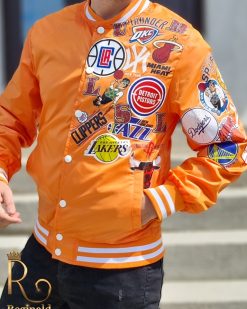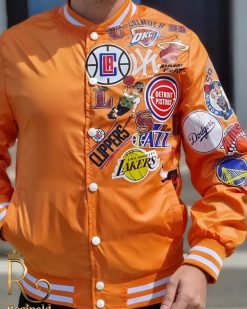 Jacheta din fas Basket Fans orange de barbati slim fit, colectia 2021 cu capse, bata elastica in talie si incheieturi. Etichete echipe baschet pe piet si brat.
