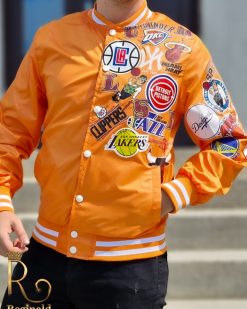 Jacheta din fas Basket Fans orange de barbati slim fit, colectia 2021 cu capse, bata elastica in talie si incheieturi. Etichete echipe baschet pe piet si brat.
