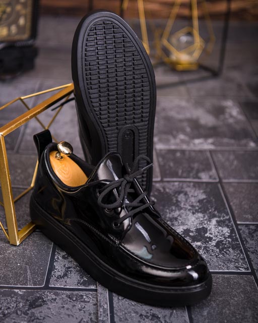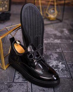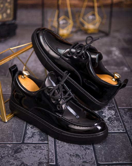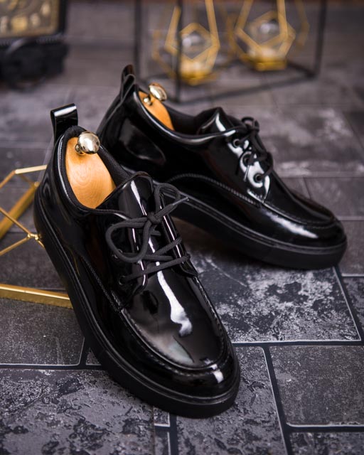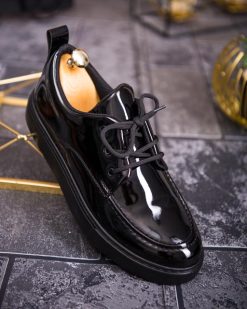 Mocasini de barbati casual, negri lăcuiti, cu șiret, talpa inalta ultra-usoara – AD655