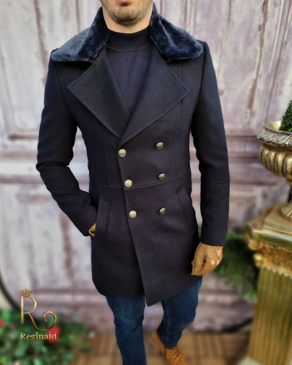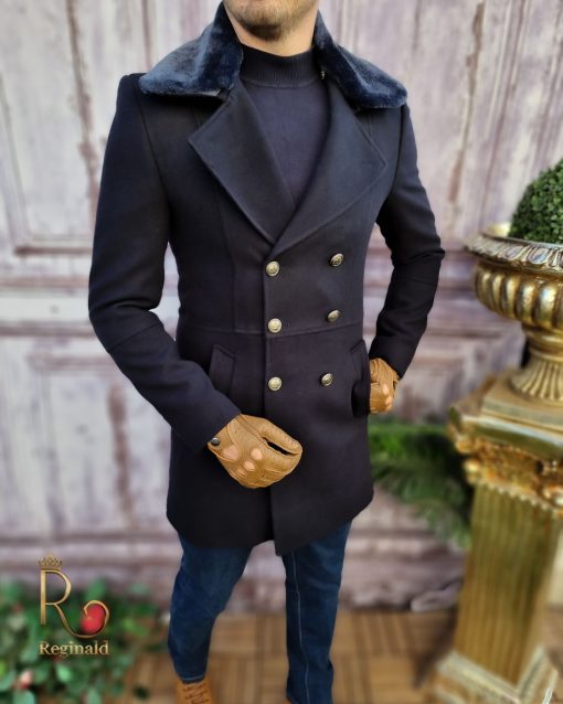 Palton barbatesc slim-fit, lung, cu blana detasabila la guler