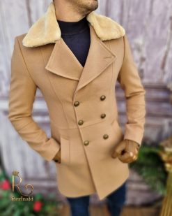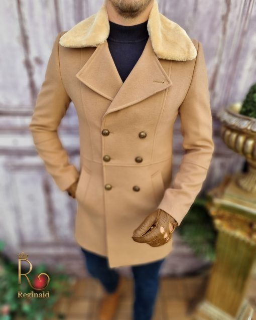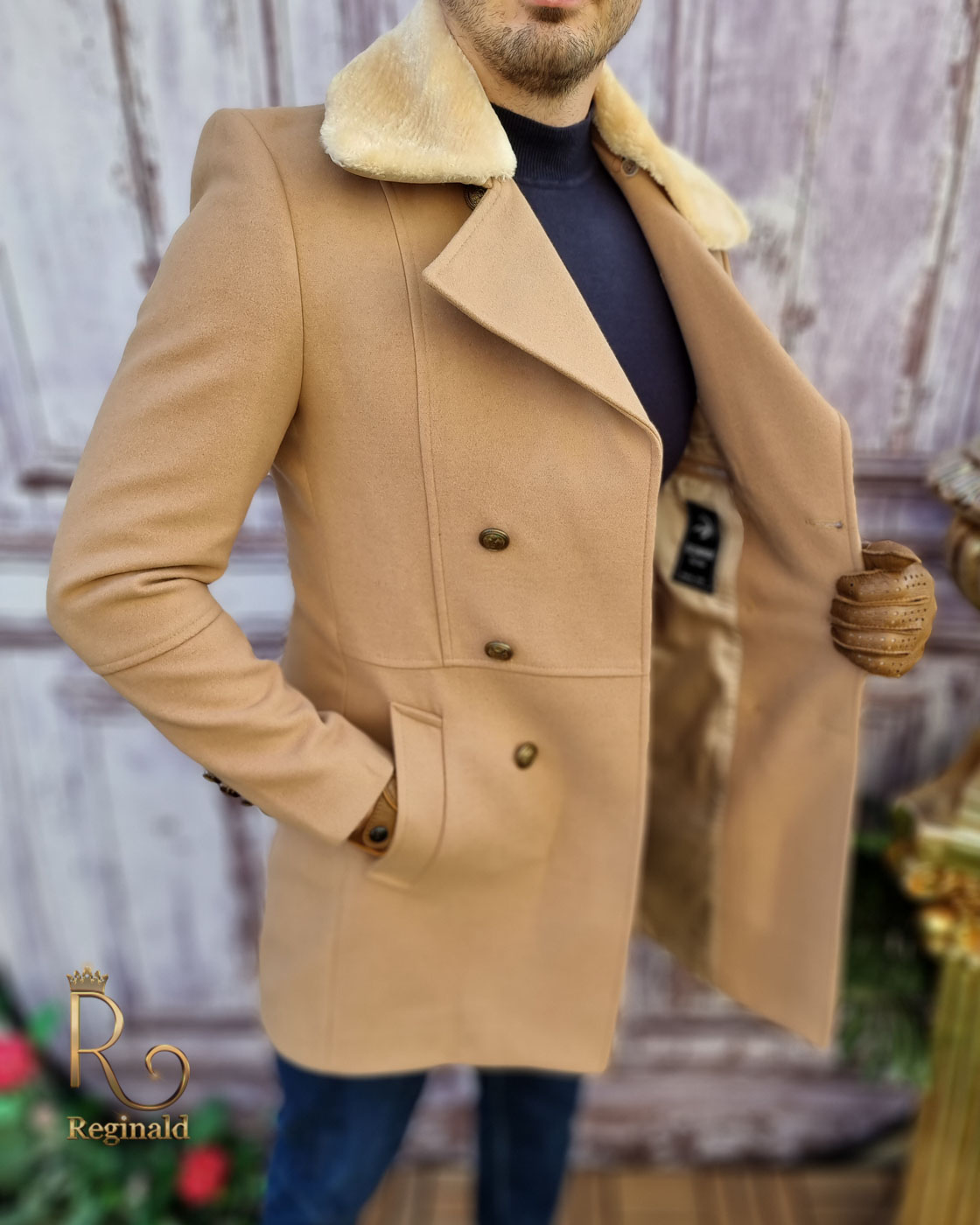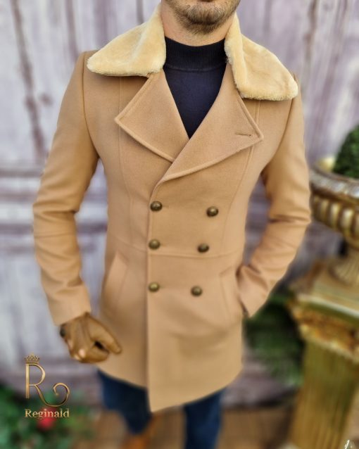 Palton barbatesc slim-fit, lung, cu blana detasabila la guler