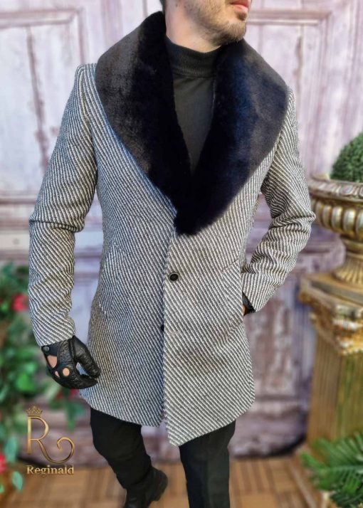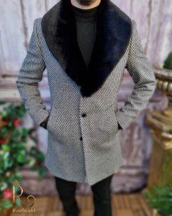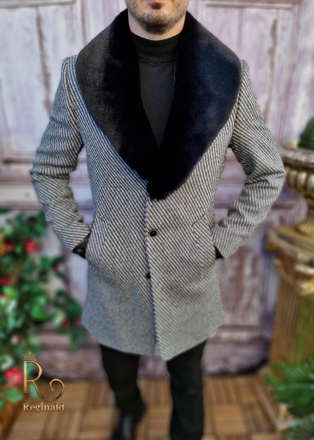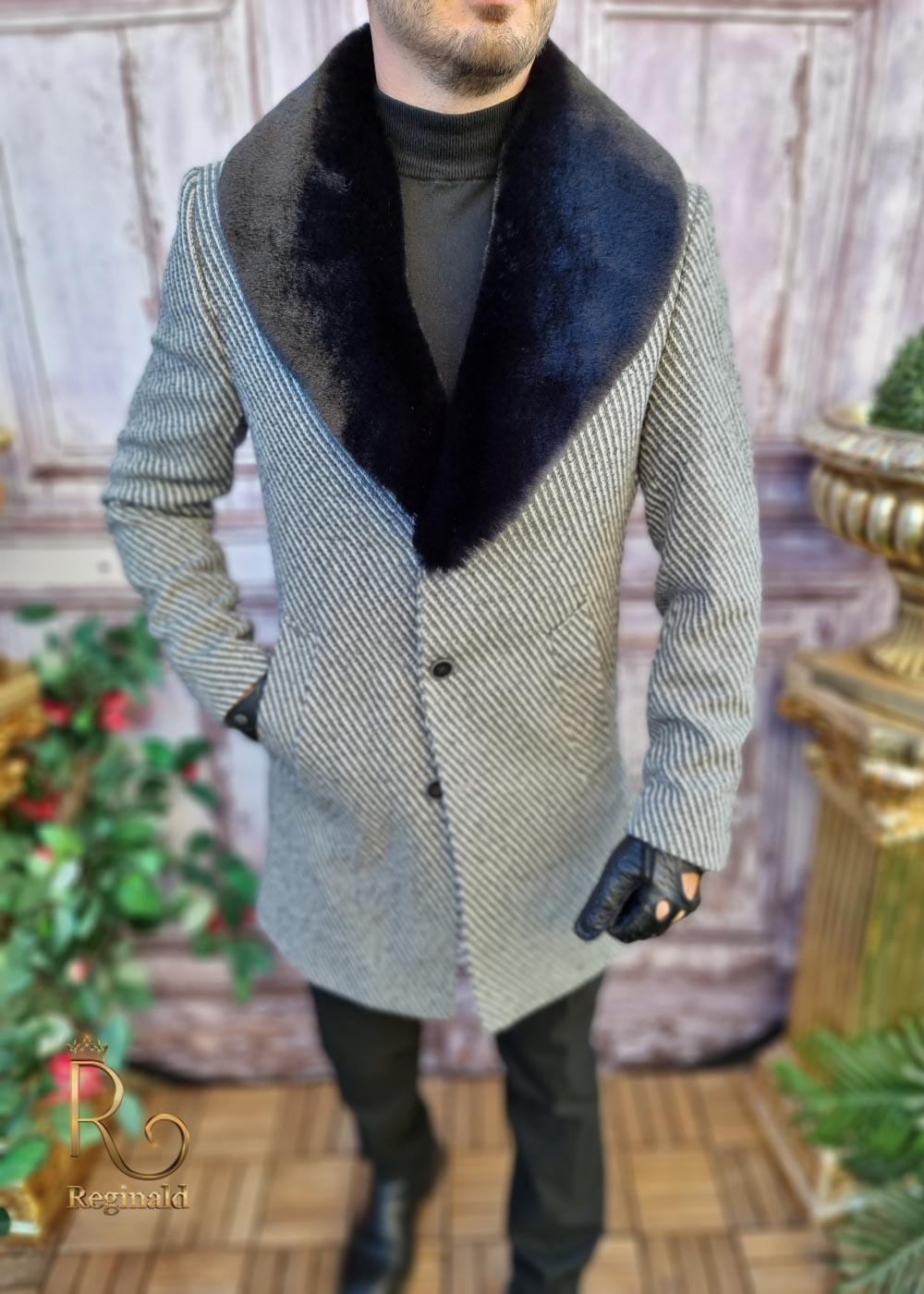 Palton de barbati, lung, cu blana la guler,detasabila, croiala slim-fit