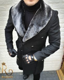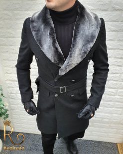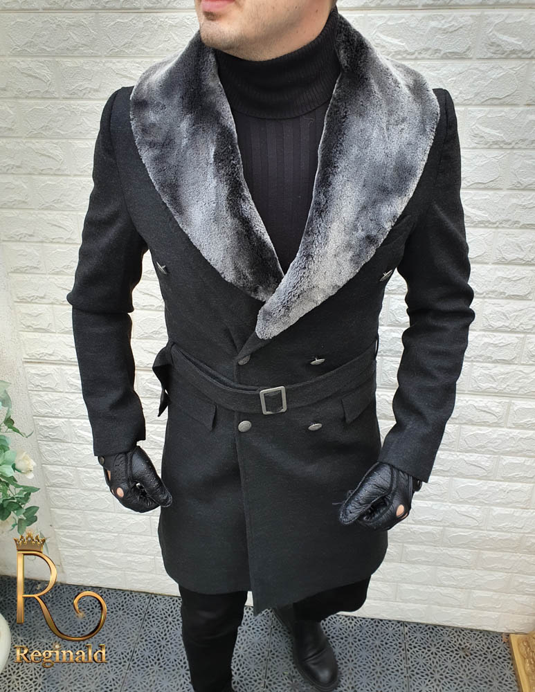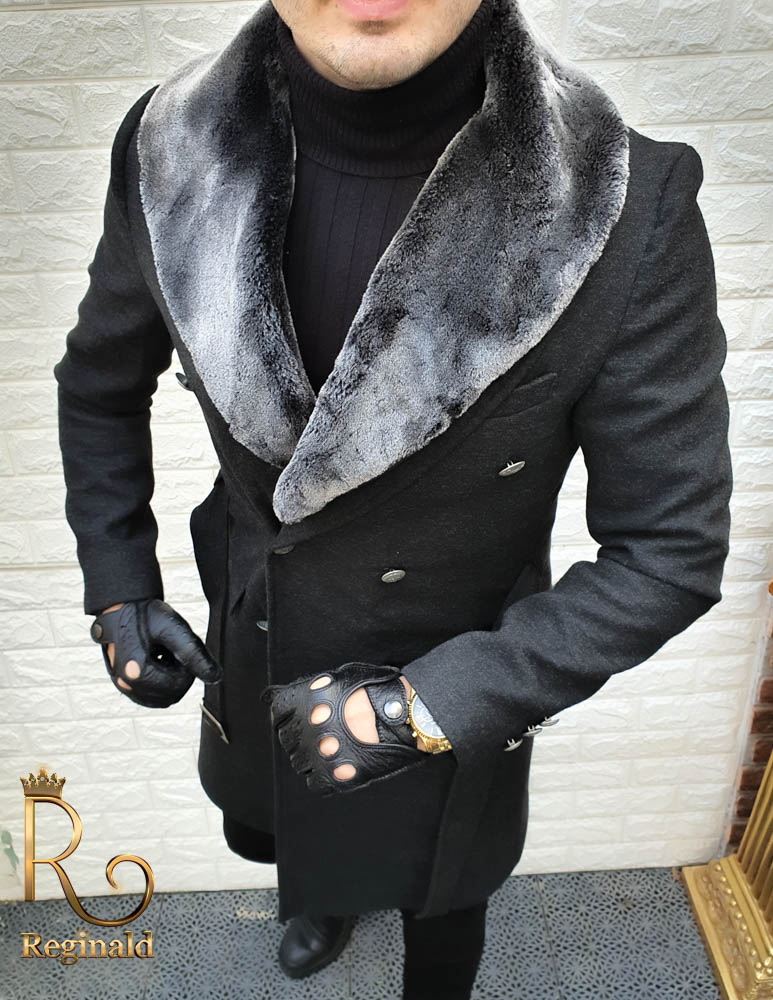 Palton de barbati, Slim Fit, gri inchis cu blana detasabila la guler