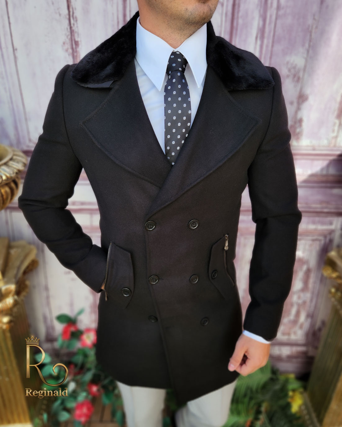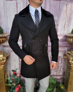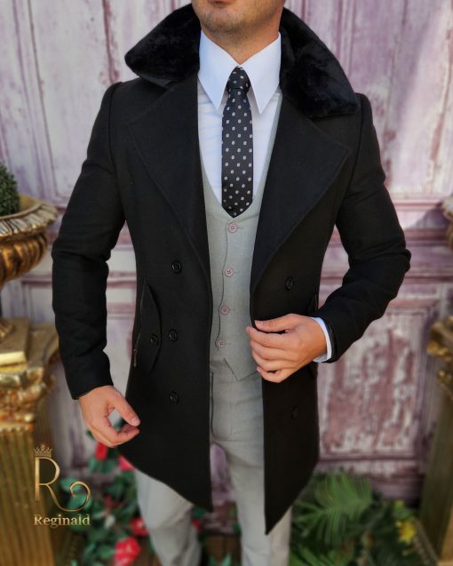 Palton de bărbați, Slim Fit, Negru cu nasturi si guler – PT450