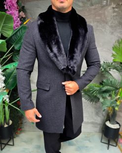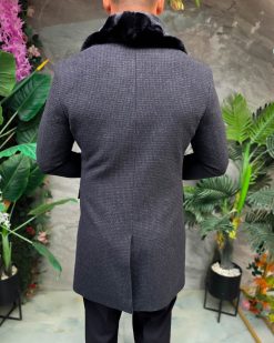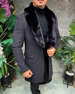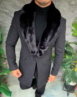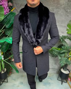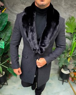 Palton lung bărbătesc gri închis texturat cu guler din blană eco neagră