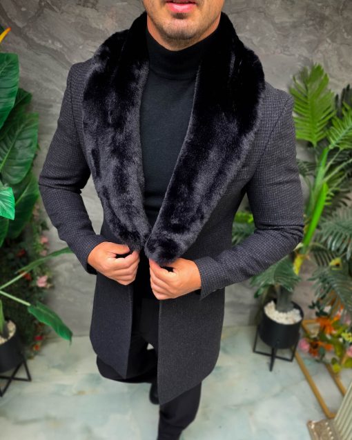 Palton lung bărbătesc gri închis texturat cu guler din blană eco neagră