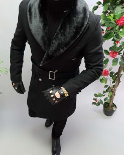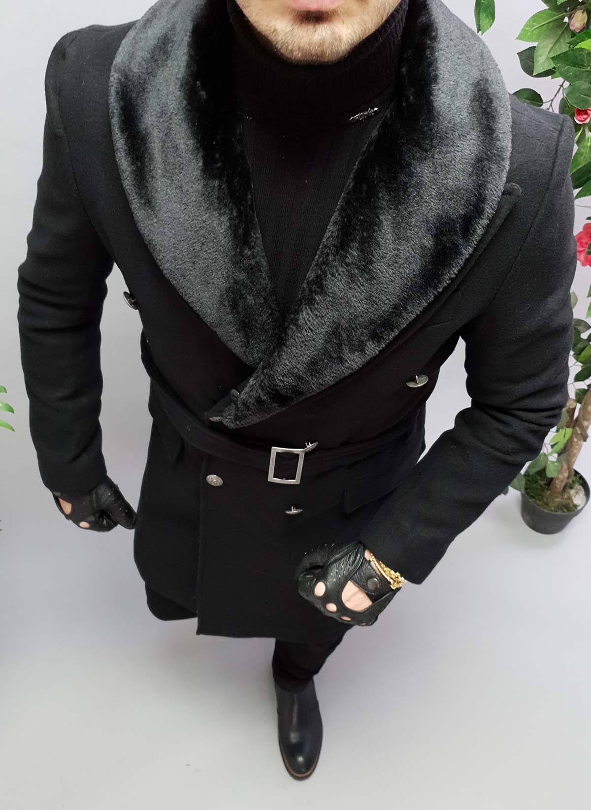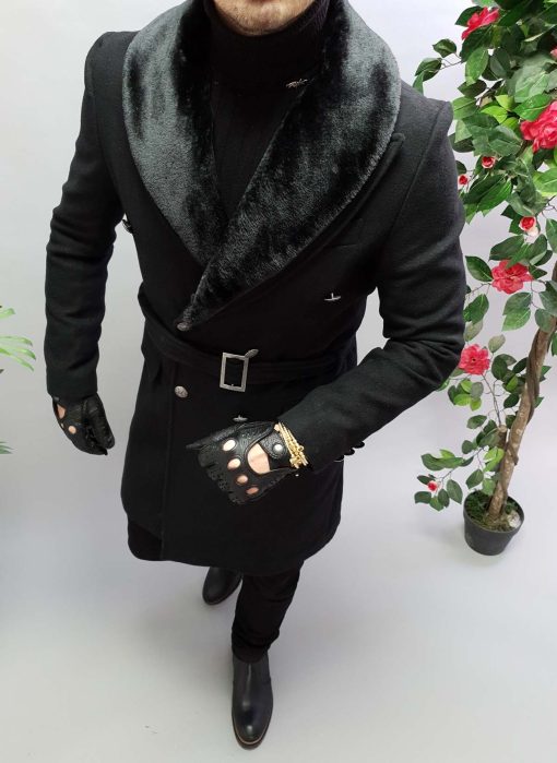Palton lung, negru de barbati Slim Fit cu cordon in talie