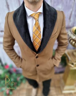 Palton barbatesc slim-fit, lung, cu blana detasabila la guler