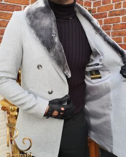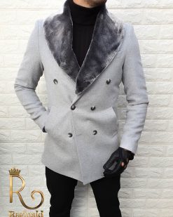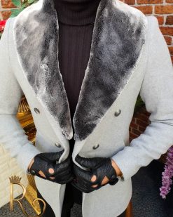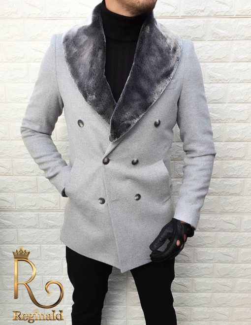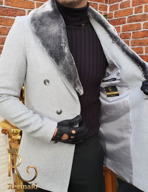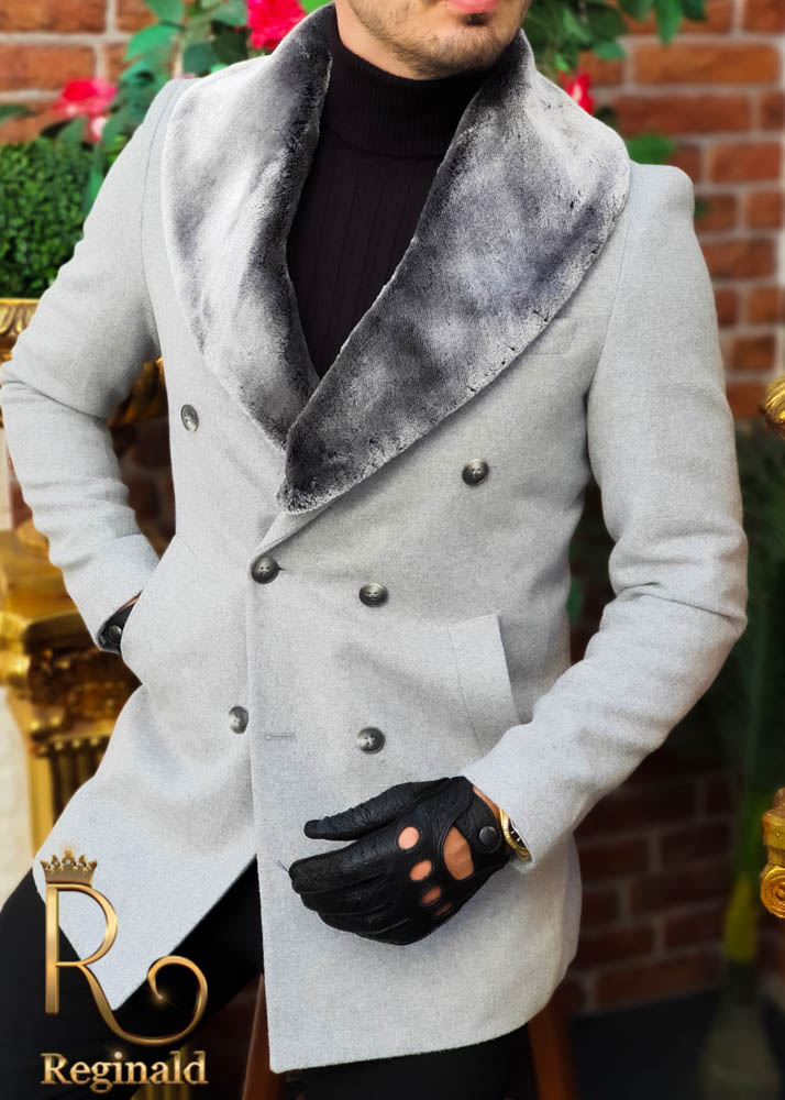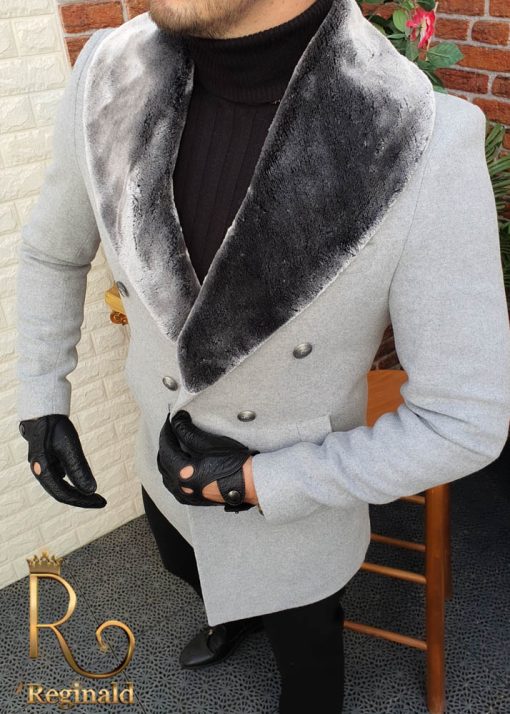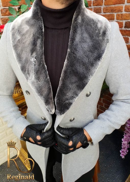 Palton slim fit gri cu blana la guler, colectia toamna-iarna 2020/2021