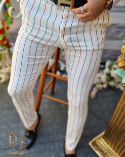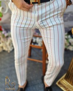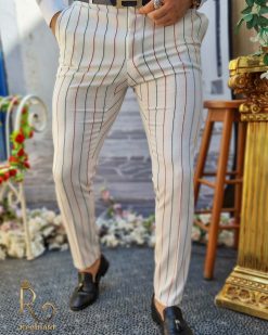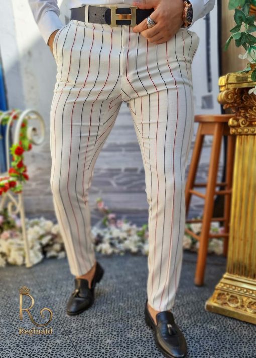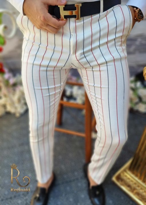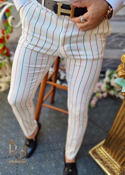 Pantaloni de barbati alb ivoire in dungi, croiala slim-fit, elastici si conici