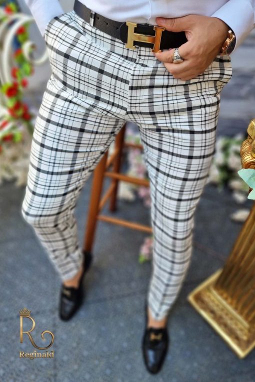 Pantaloni de barbati albi in carouri, croiala slim-fit, elastici si conici – PN505