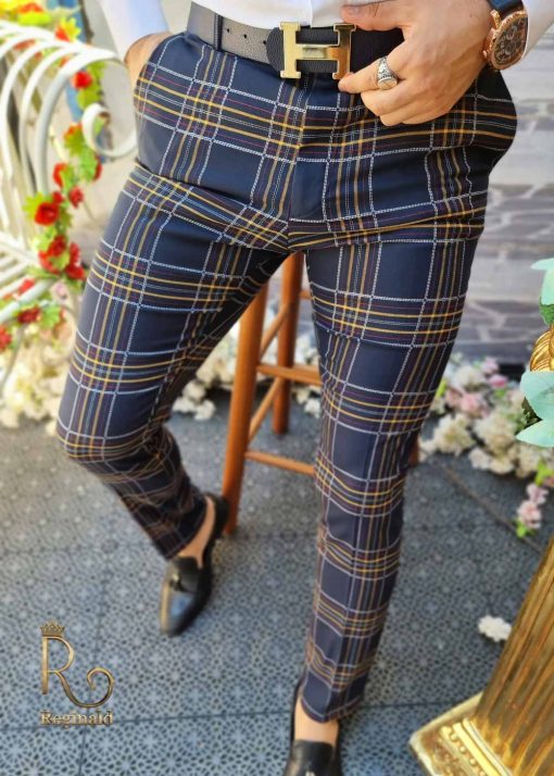 Pantaloni de barbati bleumarin in carouri, croiala slim-fit, elastici si conici