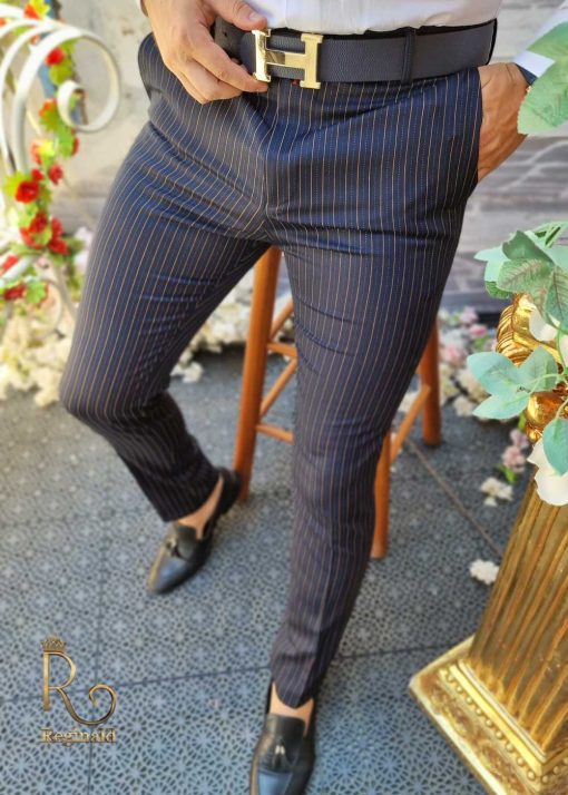 Pantaloni de barbati bleumarin in dungi aurii,croiala slim-fit, conici si elastici