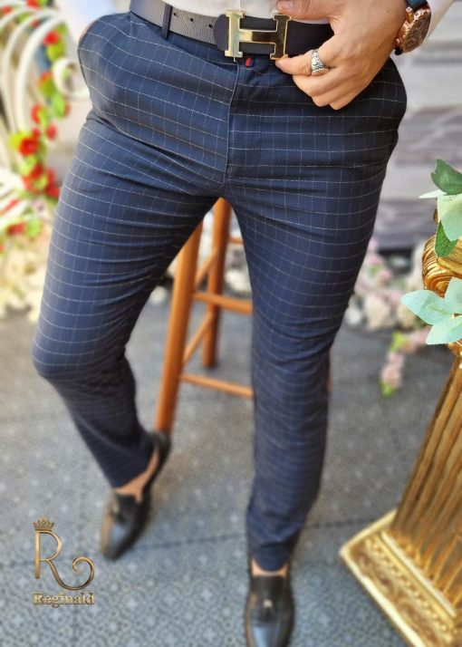 Pantaloni de barbati bleumarin in patratele, croiala slim-fit, conici – PN535