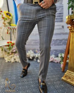 Pantaloni de barbati gri in dungi, croiala slim-fit, elastici si conici