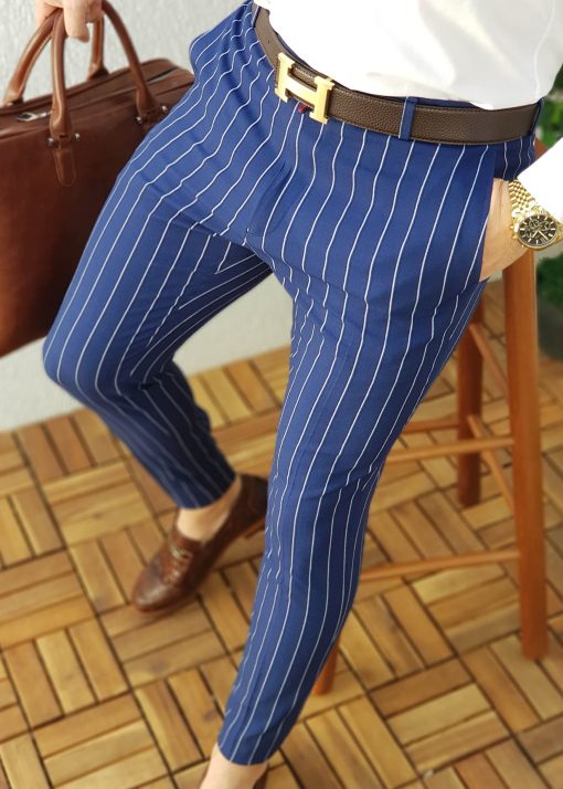 Pantaloni de bărbați, Slim Fit, Bleumarin in dungi albe, conici – PN226
