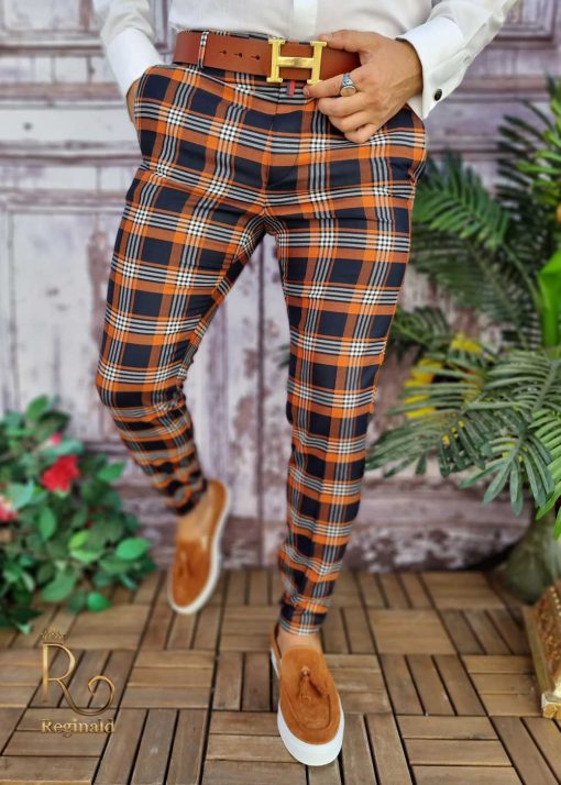 Pantaloni de barbati eleganti, croiala slim-fit, elastici si conic, bleumarin in carouri caramizii