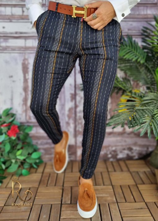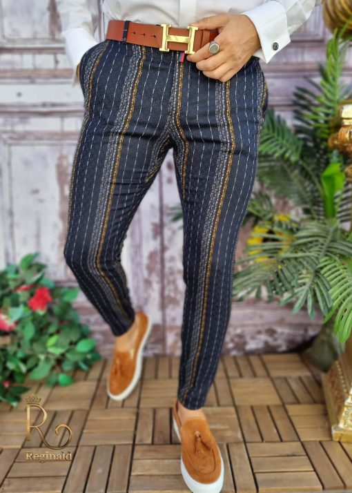 Pantaloni de barbati eleganti, croiala slim-fit, elastici si conic, bleumarin in dungi maro