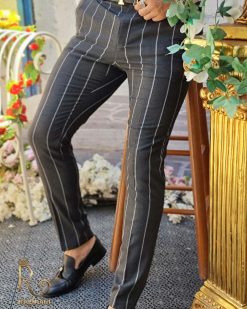 Pantaloni de barbati gri inchis in dungi, croiala slim-fit, conici