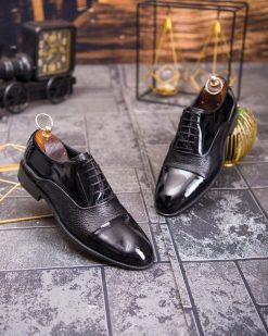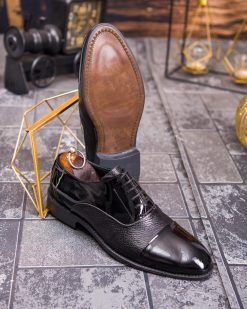 Acești pantofi bărbătești eleganți sunt confecționați din piele naturală texturată combinată cu piele naturala lacuită, rezultând un contrast rafinat și sofisticat. Designul Cap Toe adaugă un plus de eleganță, iar materialele de calitate îi fac ideali pentru evenimente, ceremonii sau ținute business.