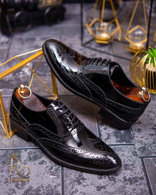 Pantofi eleganti de barbati din piele naturala, negru lacuit cu model impletit, colectia Reginald. Pantofi realizat din piele de cea mai înaltă calitate perfecti pentru toate ocaziile formale.