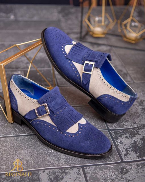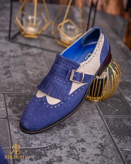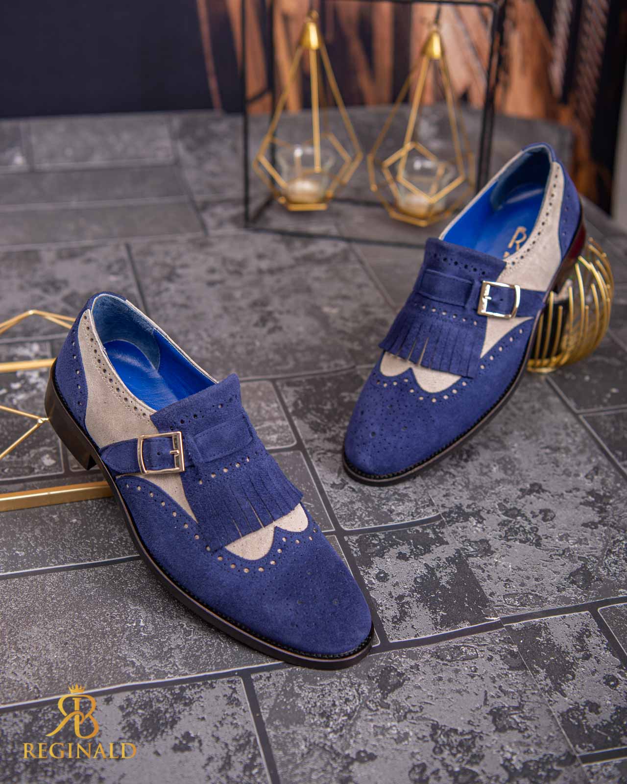 Pantofi Loafers albastri/bej, cu catarama, piele intoarsa – P1796