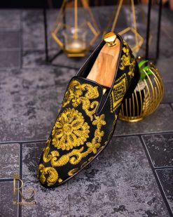 - Stil loafers/mocasini piele neagra cu brodat fir auriu