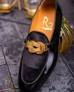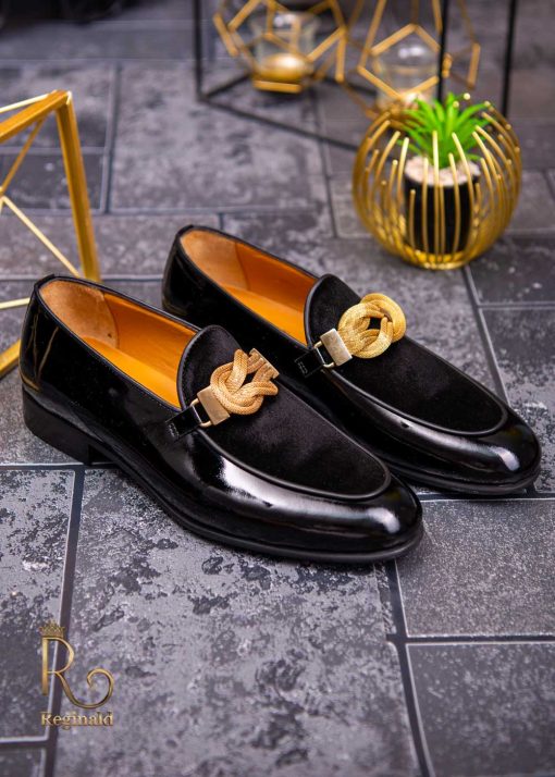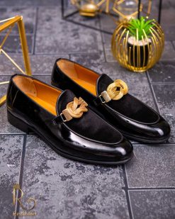 Pantofi Loafers de barbati din piele naturala, negri cu accesoriu auriu – P1358