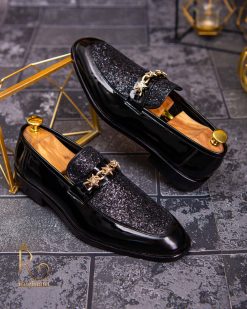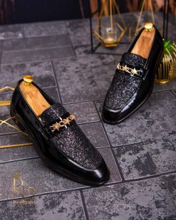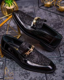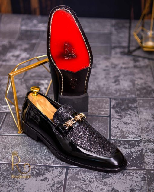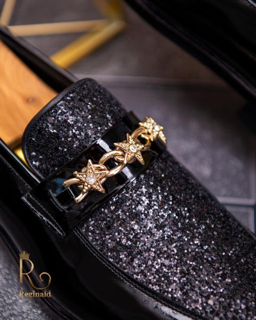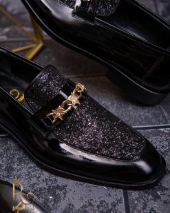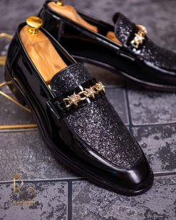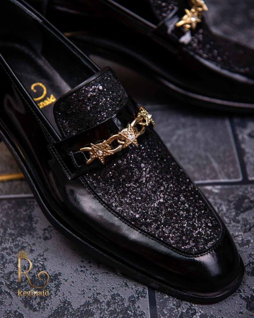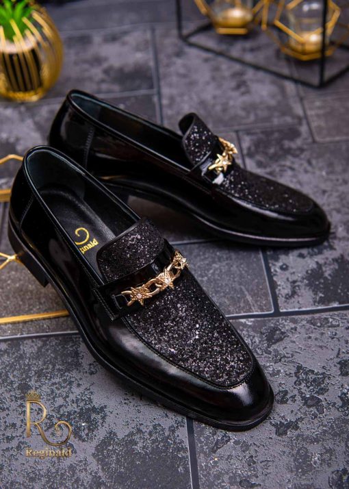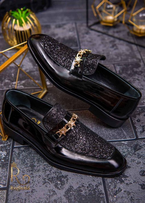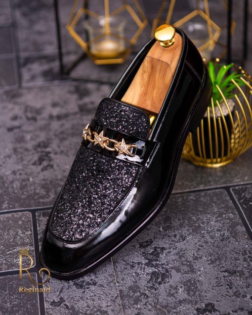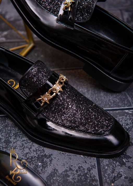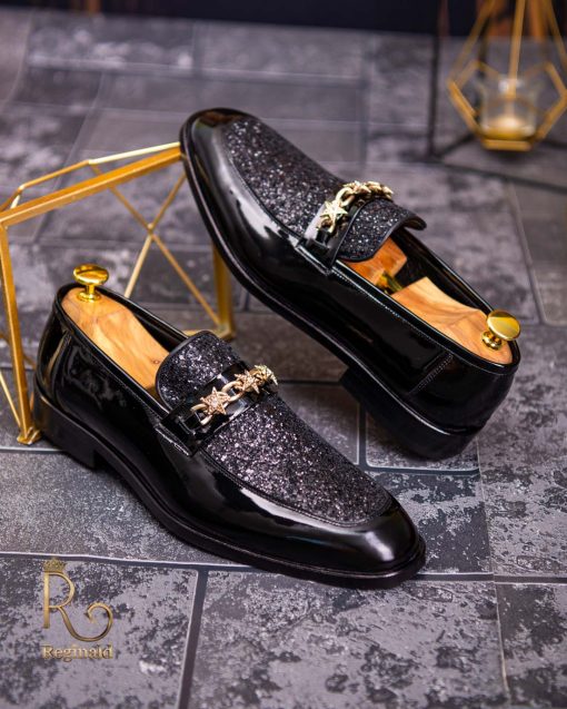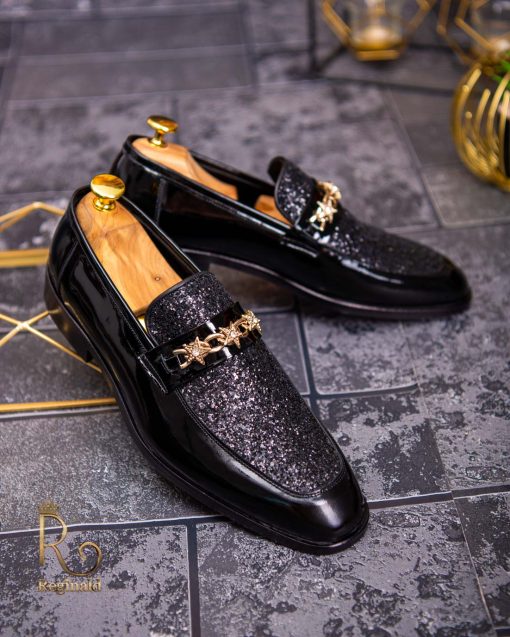 Pantofi Loafers de barbati din piele naturala, negri lacuiti cu sclipici, colectia Reginald. Pantofi realizat din piele de cea mai înaltă calitate perfecti pentru toate ocaziile formale.