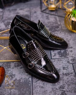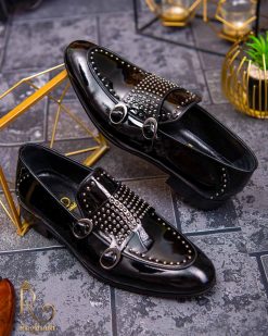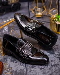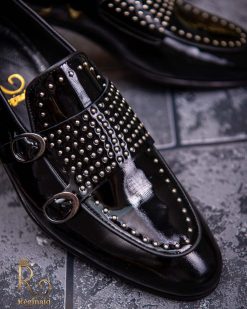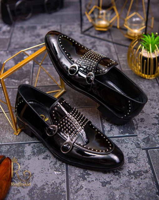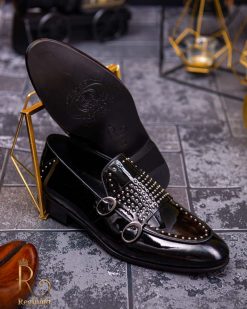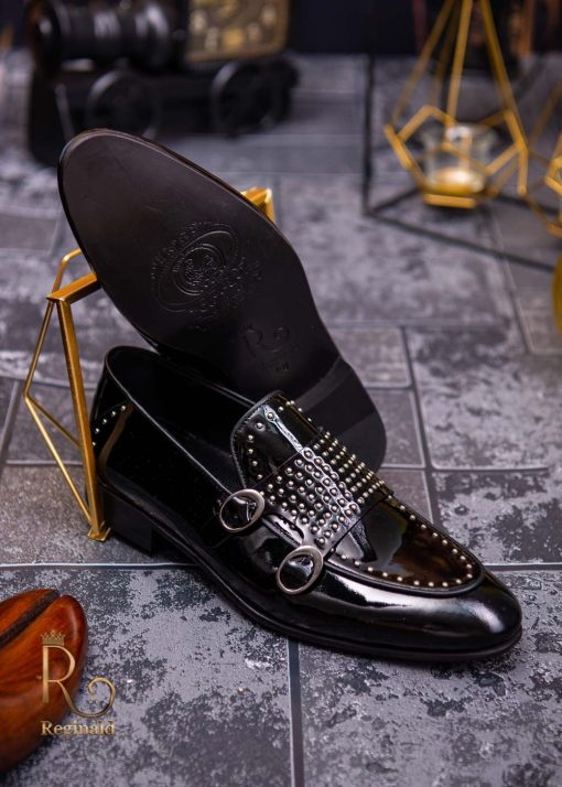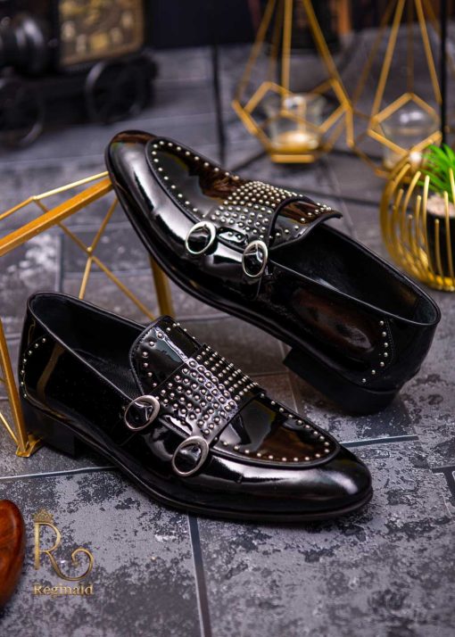 - Stil loafers/mocasini negri lacuiti , cu tinte, si catarama dubla