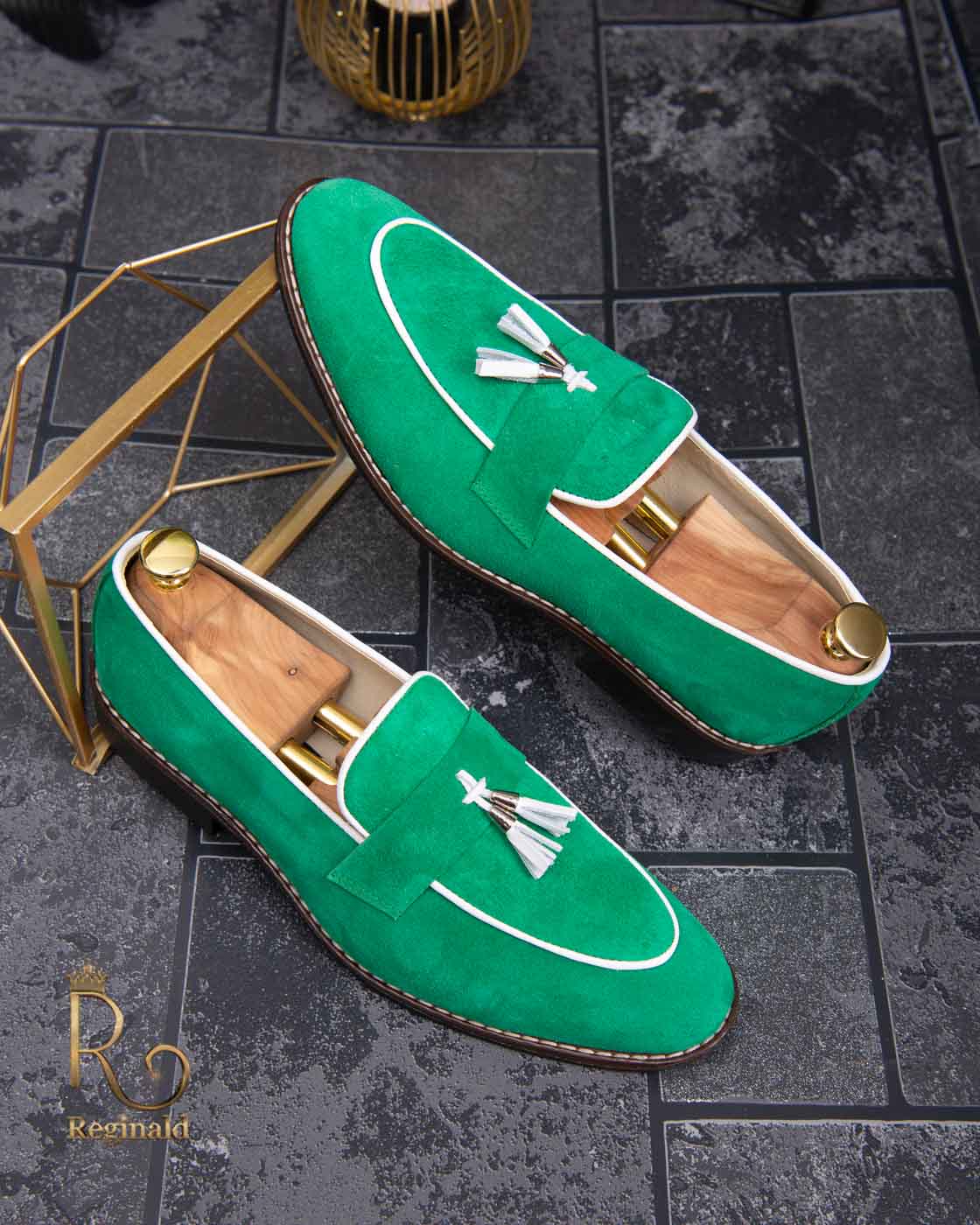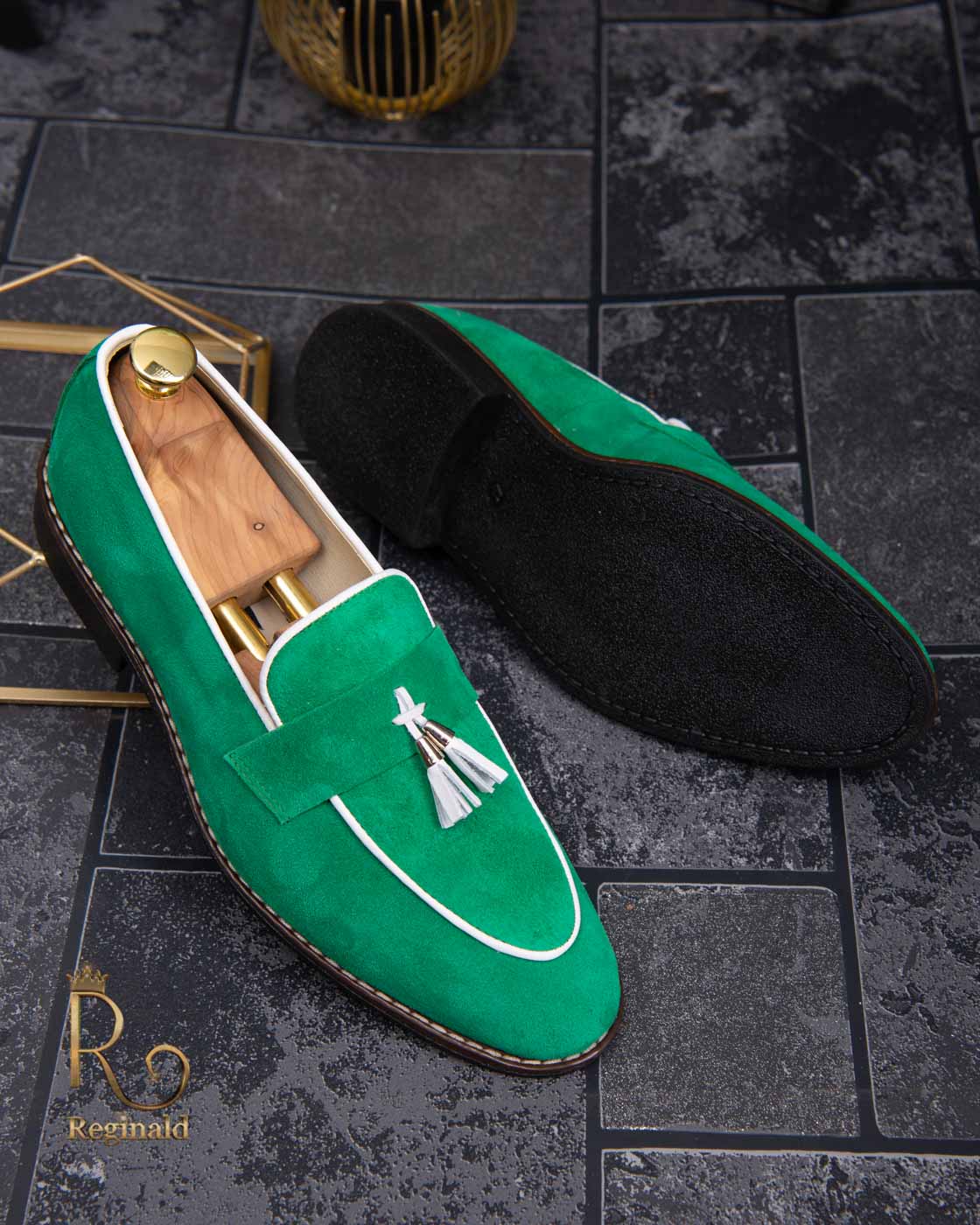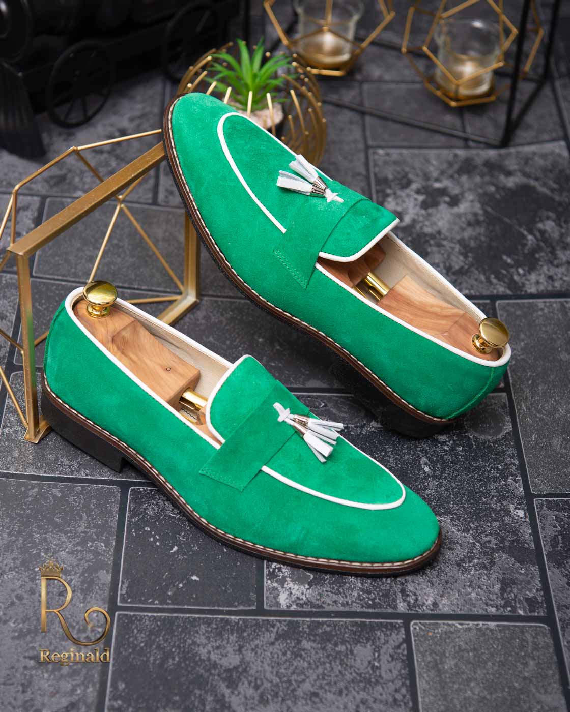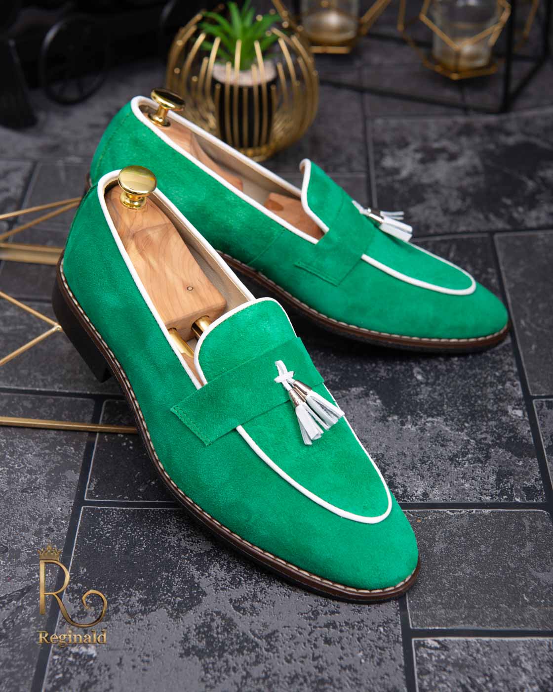 Pantofi Loafers de barbati, Verde imperial, Piele intoarsa, Ciucuri albi – P1305