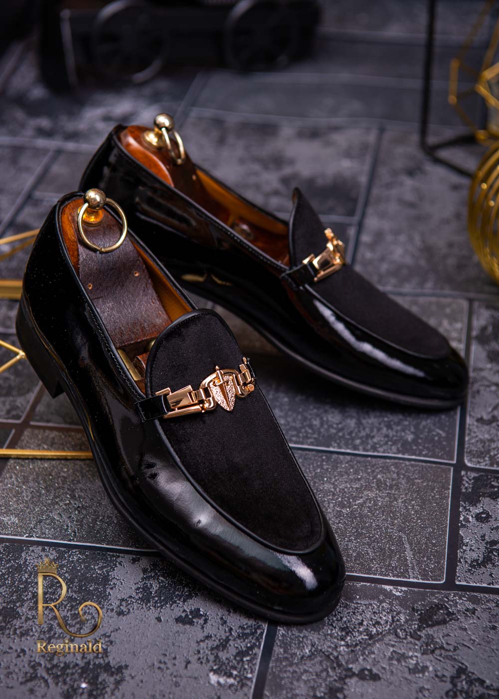 Pantofi Mocasini eleganti barbatesti din piele naturala, negru lacuit si velur, colectia Reginald. Pantofi realizat din piele de cea mai înaltă calitate perfecti pentru toate ocaziile formale.