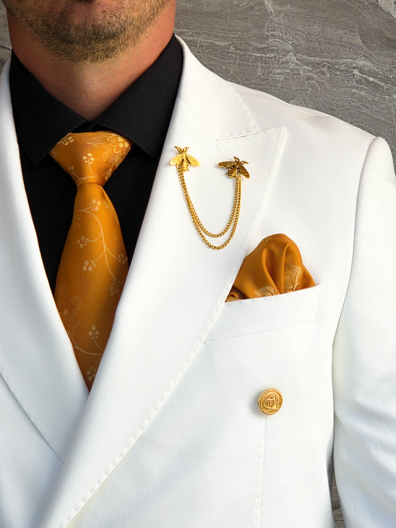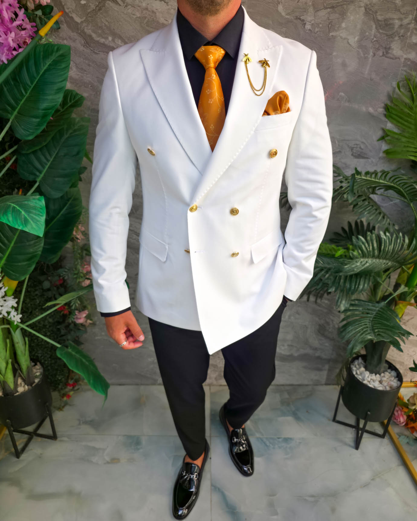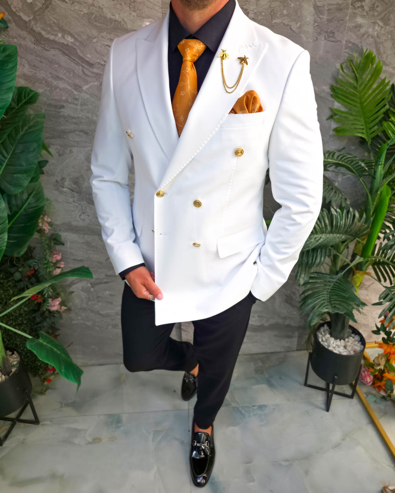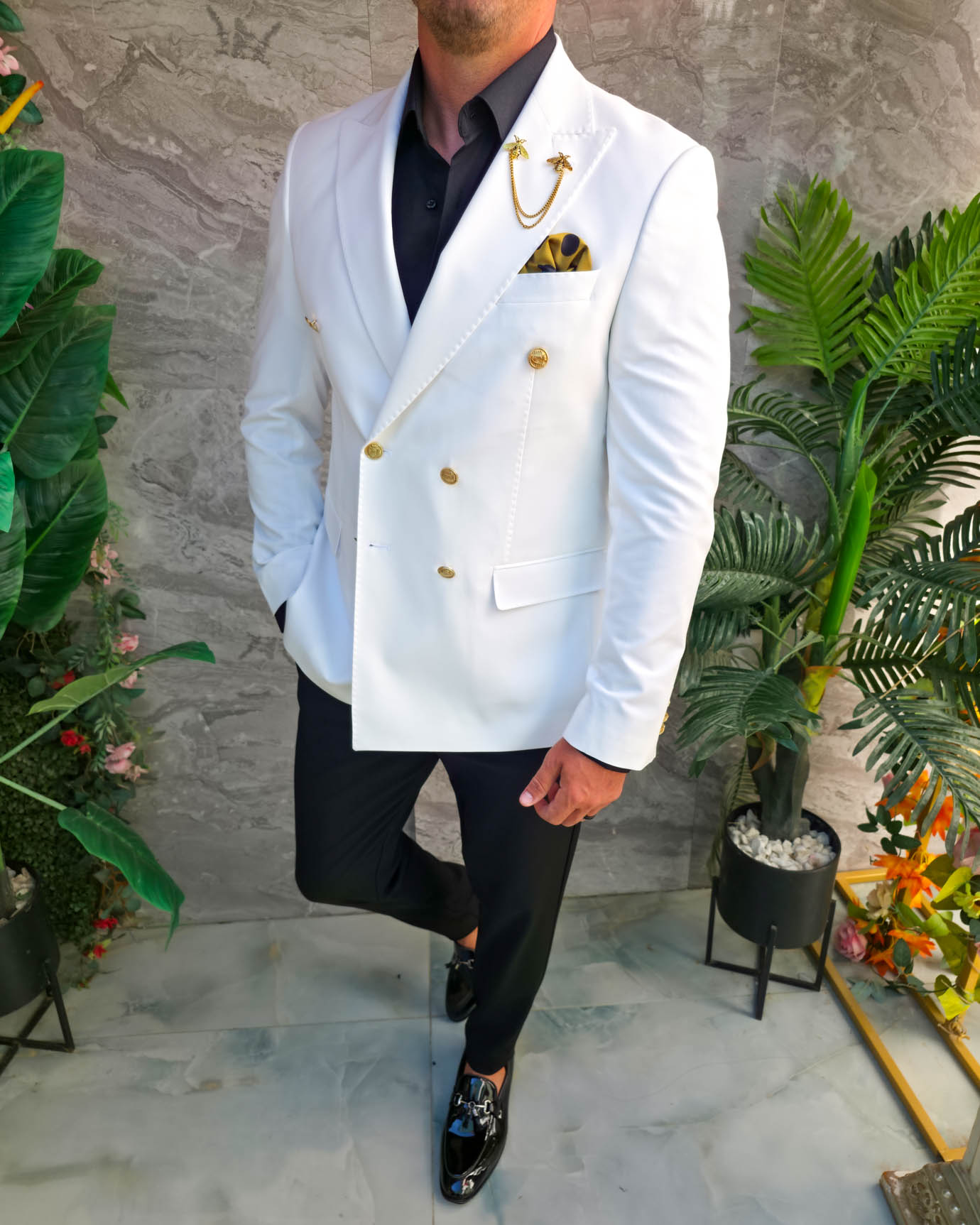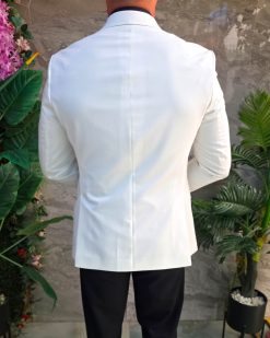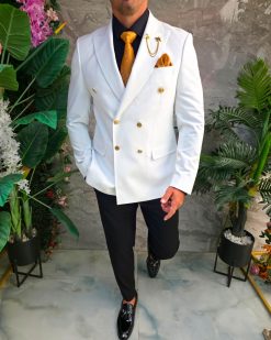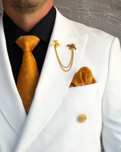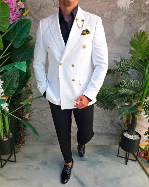 Sacoul impresionează prin contrastul dintre albul impecabil și accesoriile aurii, fiind alegerea perfectă pentru bărbatul care vrea să iasă în evidență prin stil, clasă și eleganță.
