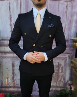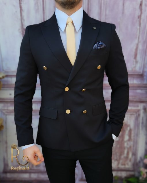 Sacou Blazer slim fit barbatesc cu doua randuri de butoni metalici aurii.