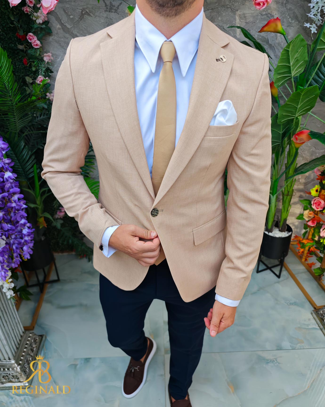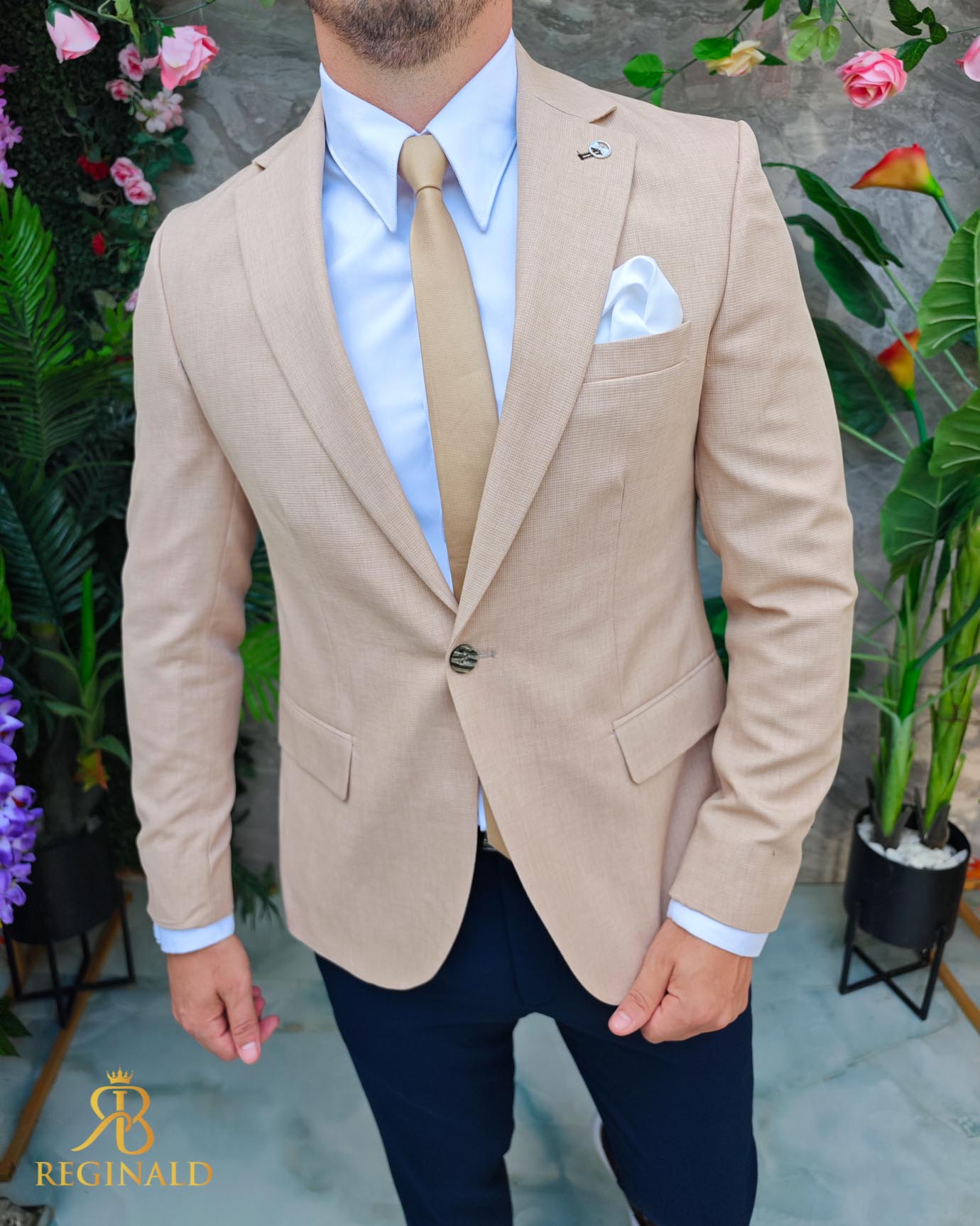 În general, un sacou de bărbați slim fit cu prindere într-un singur nasture poate fi purtat cu o cămașă elegantă și pantaloni asortați, pentru un aspect elegant.