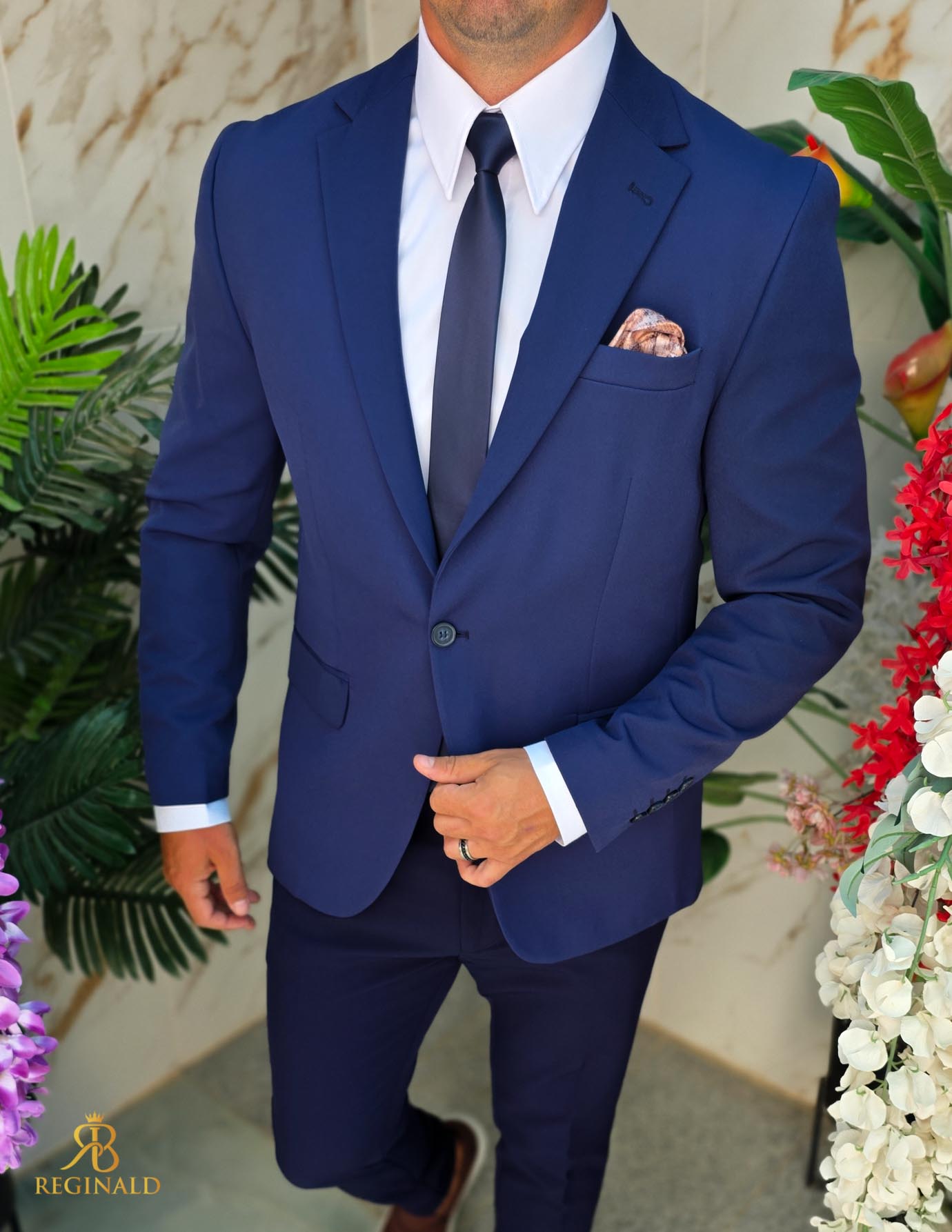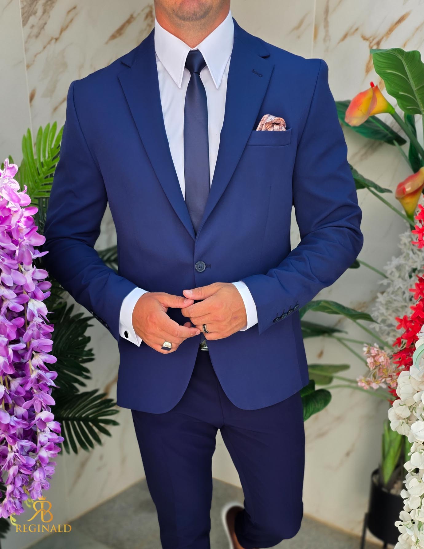 În general, un sacou de bărbați slim fit cu prindere într-un singur nasture poate fi purtat cu o cămașă elegantă și pantaloni asortați, pentru un aspect elegant.